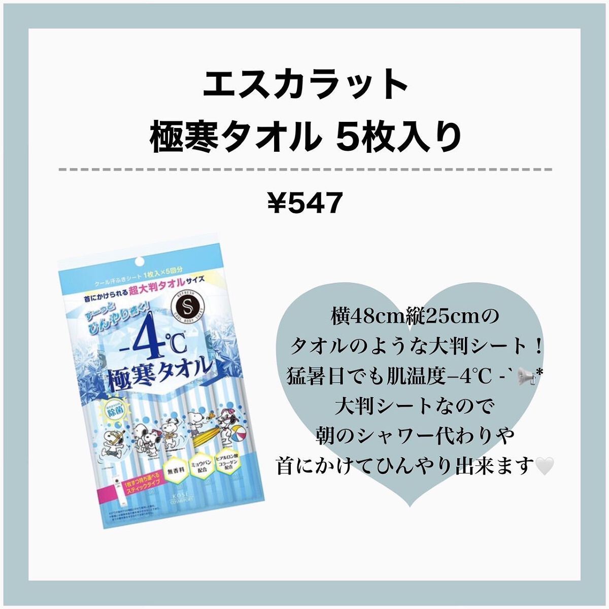 酷暑に可愛く備えよう!スヌーピーひんやりアイテム情報🩵2025年4月21日数量限定発売#エスカラット ☑︎極寒ミスト☑︎極寒タオル極寒ミストはアイスレモネードティの香り極寒タオルはネロリ&サボンの香り極寒ミストは肌に直接スプレーすることも、髪...