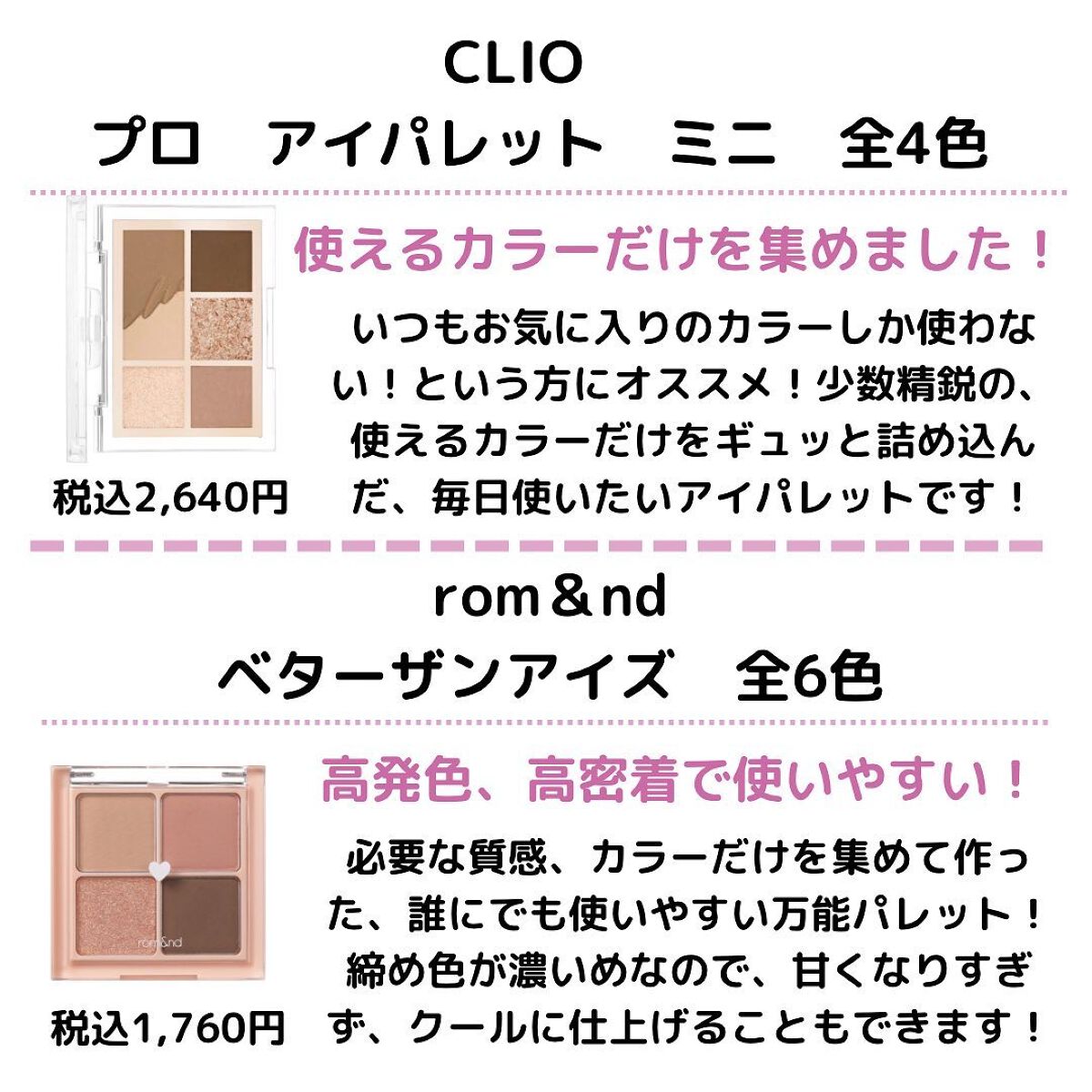 捨て色なしで間違いないクリオのアイパレ✨ 101 ローズダイアリーはイエベ向きのカラー。全色キラキラのラメ入りで全体的に華やか! 輝くウォームローズピンクカラーが可愛いし普段使いしやすい◎ 10 シーズンプラムはブルベにおすすめ! 甘さが際立つプラムカラーでラメなしのマットからキラキラざくざくのラメまでいろんな質感でメイクを楽しめる✨ 1つのアイパレットで何パターンもメイクを楽しめるから持っていて損はないアイテムです✨