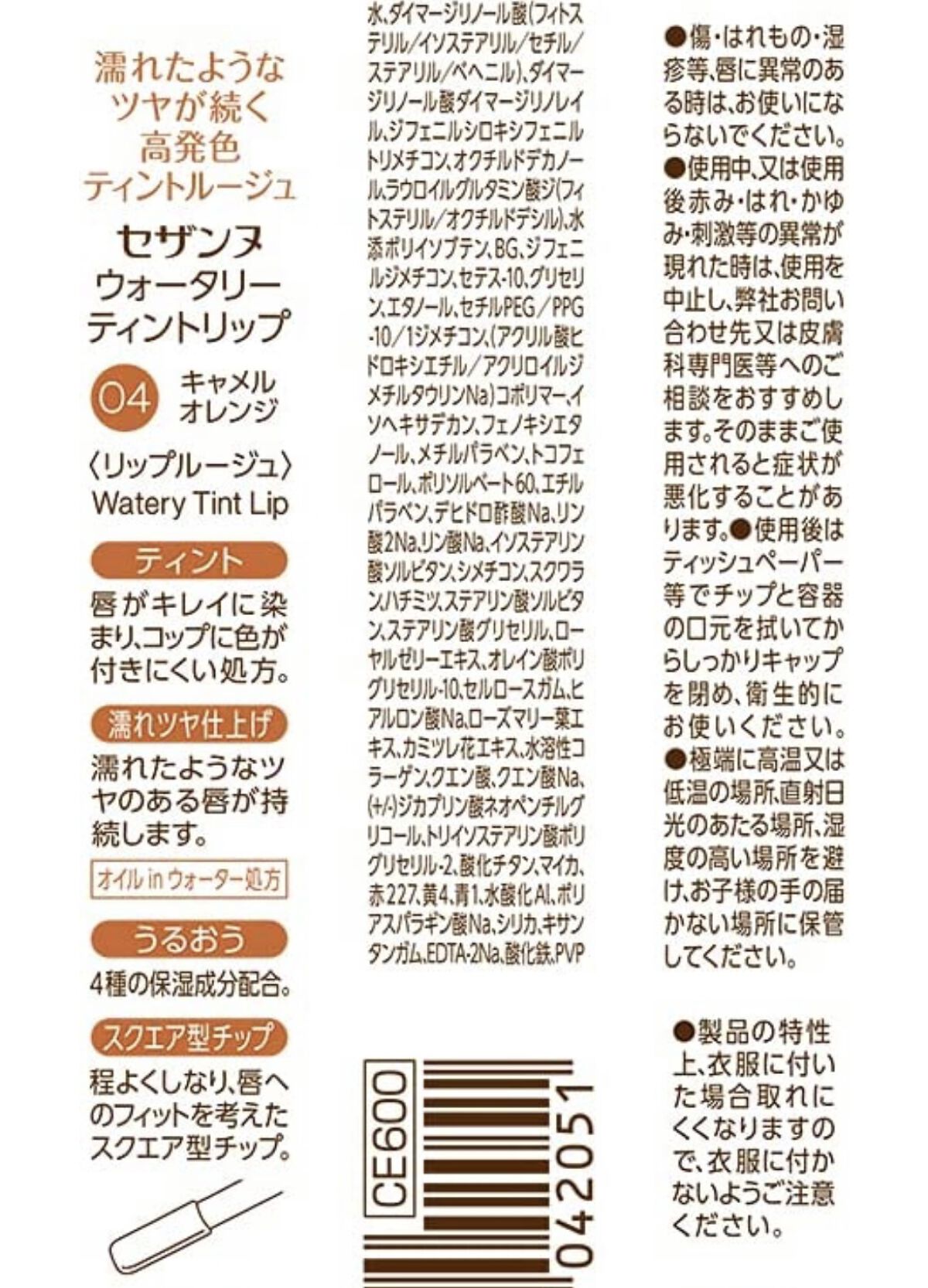 - ツヤ×色×潤いをキープする、セザンヌの新濡れツヤリップ みずみずしい濡れツヤ感ある仕上がりで、発色とツヤが長続きするティントリップです。ティントの発色を透明のベールで覆うリップコートのような処方で、ツヤ感と色をキープします。さらに、唇表面のべたつきは少なく、しっとり潤うオイルinウォーター処方を採用しています。