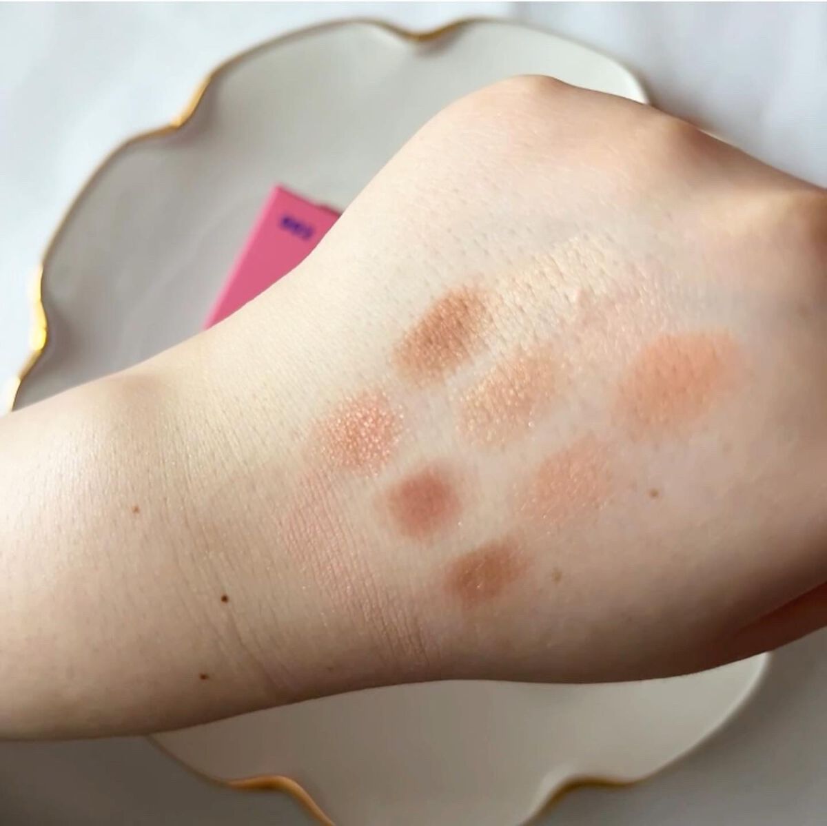 パケが遊び心のある、なんだか懐かしい絵柄の変わるカードみたいになってる。陰影をテーマに構成された手のひらサイズの10色アイパレットになっていてこれ一つで全顔完成できちゃうので持ち運ぶにはすごくいいかも! ブラウンなパレットだけど中にはピンクが入っていたり、オレンジっぽいのが入っていたりするのでその日の気分で違う雰囲気にできるところがいいところ✨ 色味も暖かみがあって可愛いのでこの1週間バンバンつかうぞー!