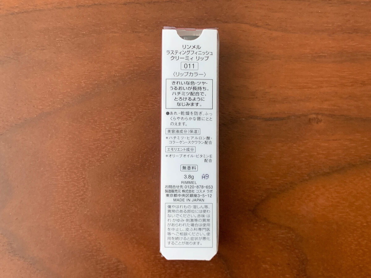 大好きなリンメルのリップレビューです。■リンメルラスティングフィニッシュクリーミィリップ011※美容液成分ハチミツ、ヒアルロン酸、コラーゲン、スクワラン※エモリエント成分オリーブオイル、ビタミンE配合色はくすんだピンクベージュ。黄みの少ない優...