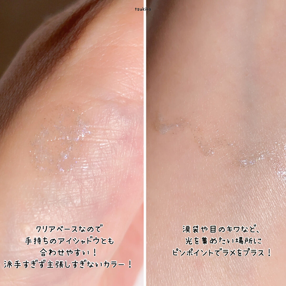 - 目元に溶け込むような繊細リキッドラメライナー。 多色ラメが目元に光を集めて透明感のあるうるみ目を演出します。 時間が経ってもうるっとしたツヤがしっかり持続するしっとり高密着処方。細やかなラメもしっかりキープしてくれます。 美容保湿成分(ヒアルロン酸Na、ビルベリー葉エキス、ハイビスカス花エキス)配合。 仕上がりは長時間キープするのにお湯で落とせます。 2022年7月7日(東急ハンズ・PLAZA・LOFT先行発売) 2022年8月10日(全国発売)