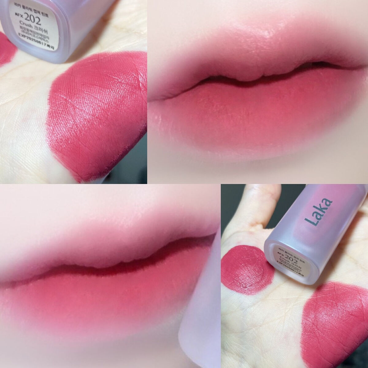 こんなマットリップが欲しかった💖LAKAの新作、花びら質感🌸LAKAフラワーキャプチャーティント全8色ある中で、「#202Crush」「#203Hipple」を選びました🫶🏻しっとりと柔らかい質感で唇に優しく荒れにくい🫧マットティントってパサ...