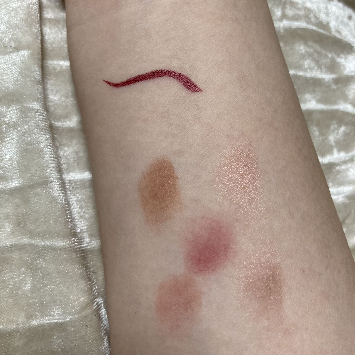 パレットの大きさは両手におさまるサイズです🤲 ピンクが好きなので購入しました。 ピンクブラウンっぽい感じになり思っていたよりも使いやすく活躍しそうな予感がします😌 チークはゴールドラメが入ってます。肌馴染み良いカラーです。 濃いピンクのラメが入っているので想像よりかなり可愛く仕がります🥰