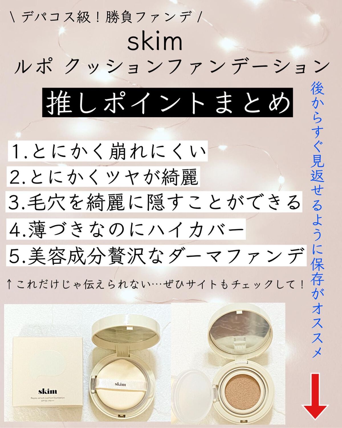 skimルポクッションファンデーション¥4980(税込)厚塗り感ゼロの薄膜肌ファンデ💓うるみツヤ肌を叶えてくれます✨3色展開で自分に合った色が見つけられる👏🏻CICA(ツボクサエキス)※1、ナイアシンアミド※1、ヒアルロ...