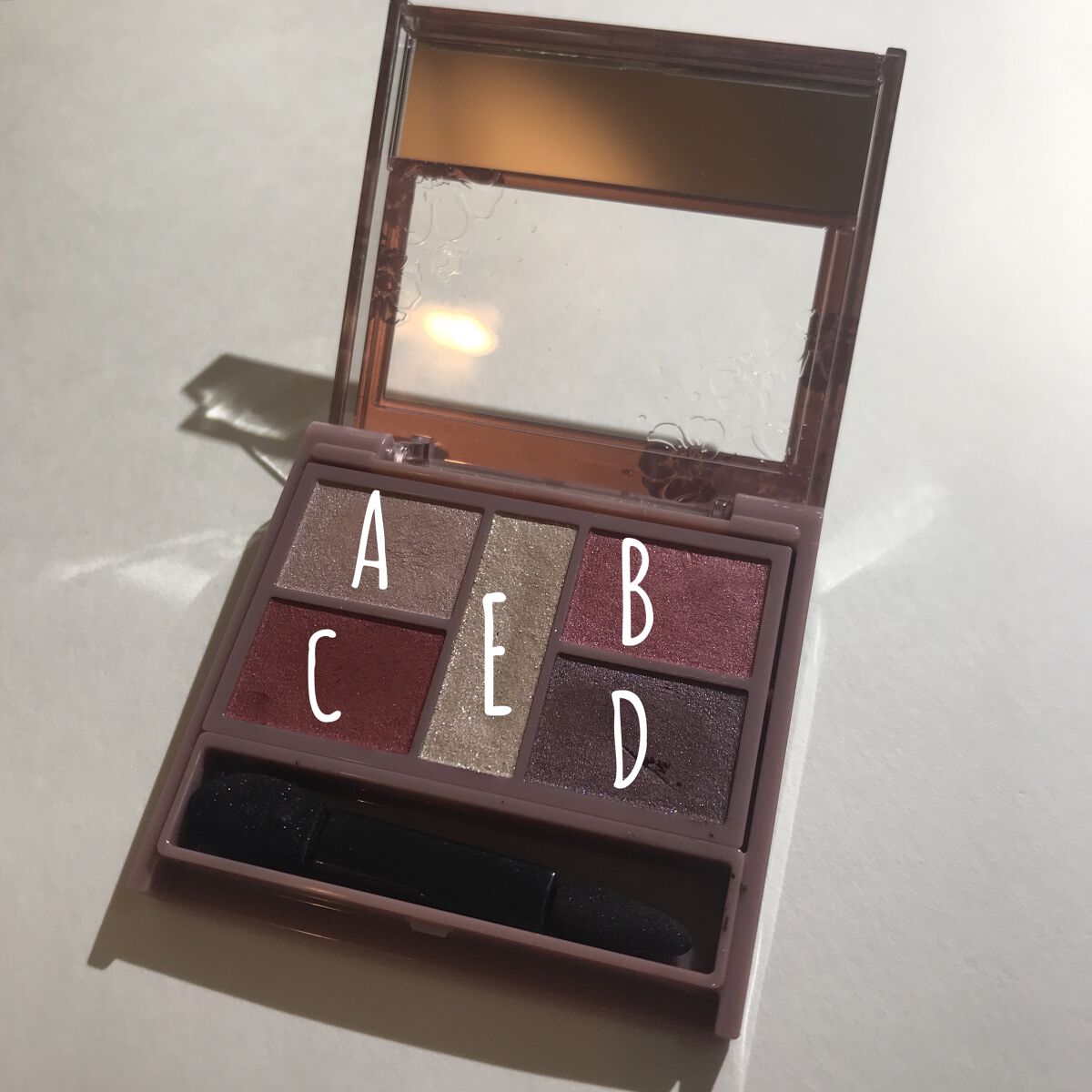 - 1枚のパレットで2つのスタイルが完成! 5色の欲ばりアイシャドウ♥ メインカラーを選んで2つのスタイルが楽しめる! A→B→D でスタイル1 A→C→D でスタイル2 繊細な粉質が、しっとりとまぶたに密着して色落ちを防ぎます。 透明感のあるキラうるトッピングジュエル(繊細ラメ)は、気分によってトッピング!