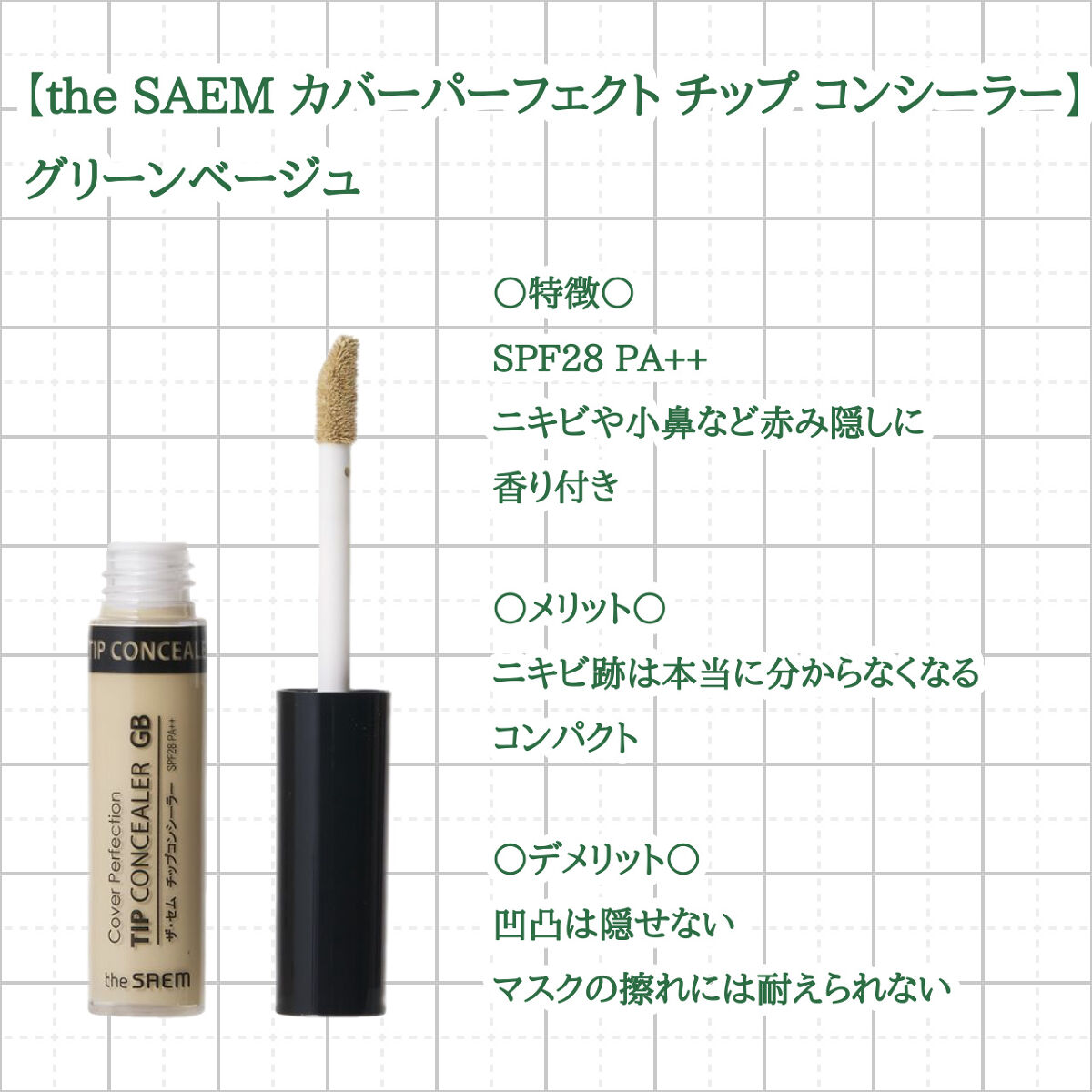 theSAEMカバーパーフェクションチップコンシーラーグリーンベージュザセムのコンシーラーはずっとリピートしていて、グリーンベージュは下地を塗った後ニキビ跡などの赤み消し用に使用チップは大きめでしっかり多めにつくので、細かい塗布は難しい緑色で...