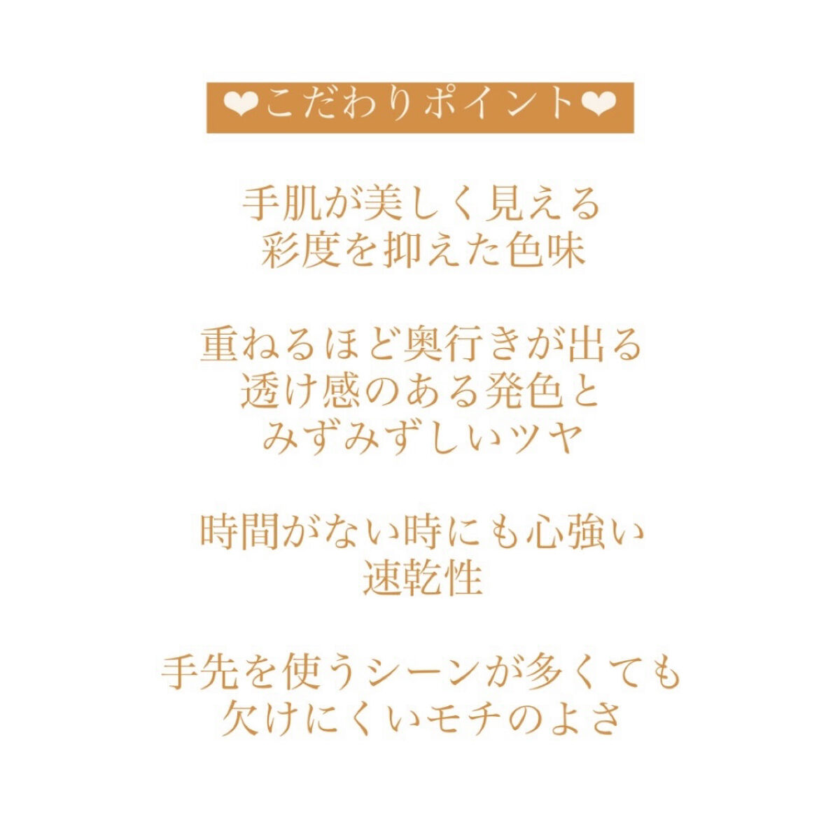 - "モチの良さ"にこだわった処方で、ベースコート無しでもしっかりと爪に密着し、 塗りたての美しさが長く続きます。なめらかな塗り心地で、ムラなく美しく塗れるテクスチャ。
