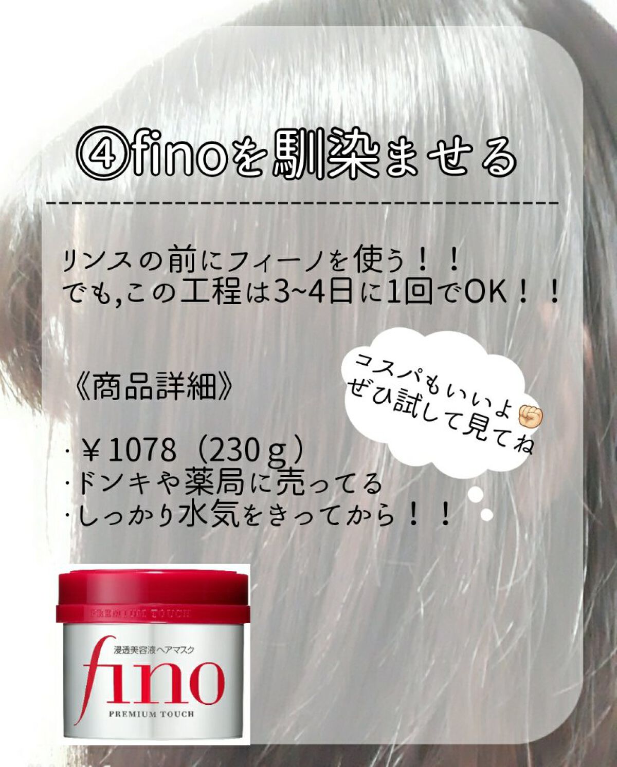 #髪の毛サラサラ今今夜のヘアケア明日はお出かけなので気分上げたくって、週2の特別なヘアケア。サラサラしっとりになって嬉しい♡使った商品はフィーノ プレミアムタッチ 濃厚美容液ヘアマスク本体230g洗い流すタイプ。傷んだ髪へのヘアケアに最高。た...