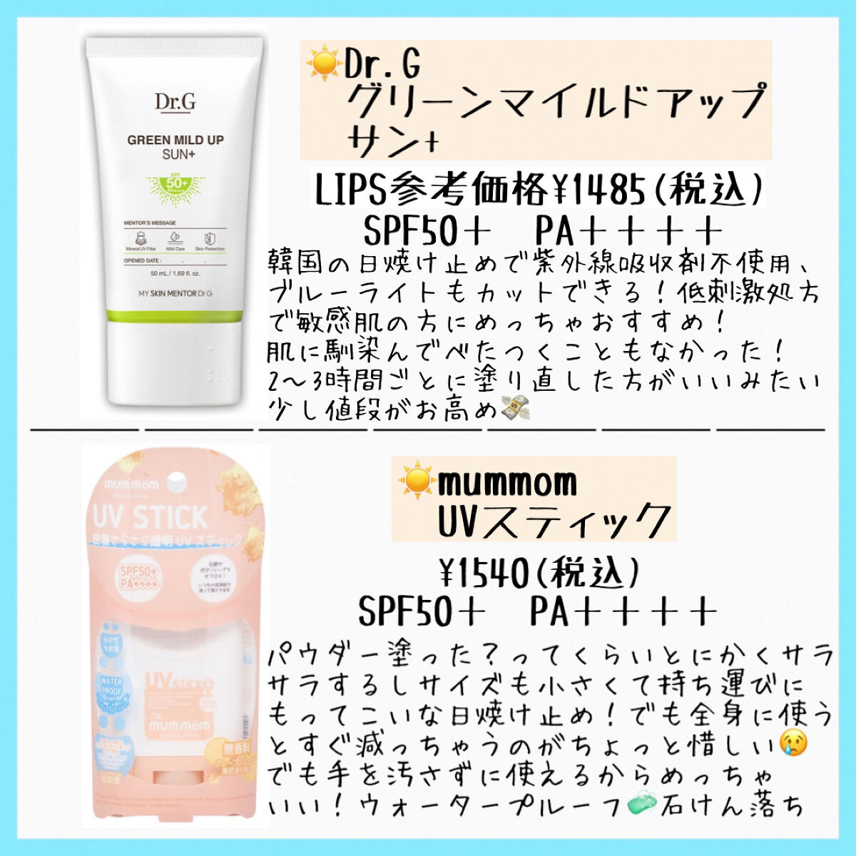 紫外線はシミの原因にもなるので2〜3時間ごとに塗り直すのがベスト! mummomのuvスティック以外はLIPSショッピングで買うことができます🛒 これからも色んな日焼け止めを試して比較していきたいので、もしおすすめの日焼け止めがあったらぜひ教えていただきたいです!🙌