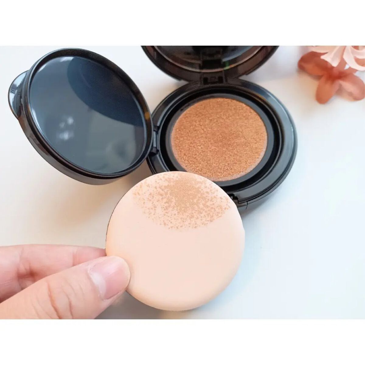 こちらはUVケアも◎ セッティングも簡単に装着できます😁 このブラック色したシンプルデザインの容器も素敵ですよね♡ パフにトントン馴染ませて肌にのせて みると少ししか取っていないのに、つきがよいですね。みずみずしいテクスチャです。 トントンなじませて伸ばしていくと 厚塗り感を感じさせない使用感です。 パフには、ほんの少しつけて内側から外にかけてポンポンと伸ばしていくのが ポイント。 つい、クッションファンデはたっぷりに なっちゃうけどほんの少しで良い◎ そうするとむらなく均一に肌にのせる ことができるね🥺