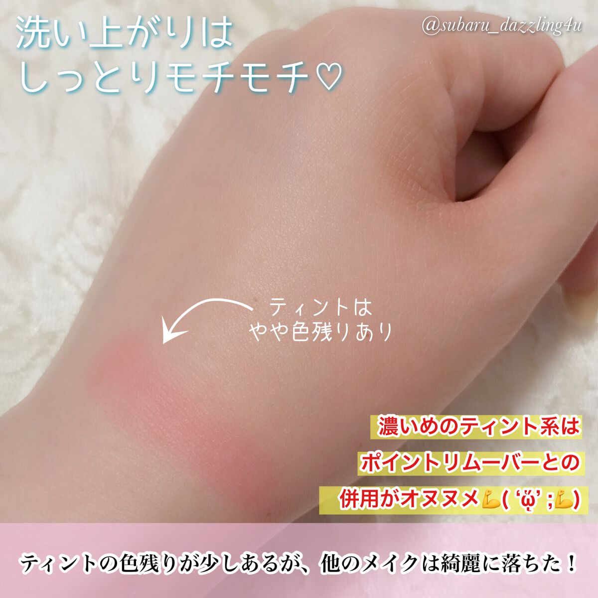 ⭕良いところ🥰・ティントでは珍しい白みピンク・塗布後は白浮きせず、程よいミルキー感・青みピンクなので透明感があり、ブルベ優勝・色残りも良い ➡︎5分後にoffしても、色味・ツヤ感あり ※3枚目の画像を参照 白みの強いミルキーピンク!ティントには珍しい、絶妙な白み具合で可憐な雰囲気になれます♡ 青みが強いのでブルベさん歓喜カラー✨透明感溢れる、美少女リップが完成👏