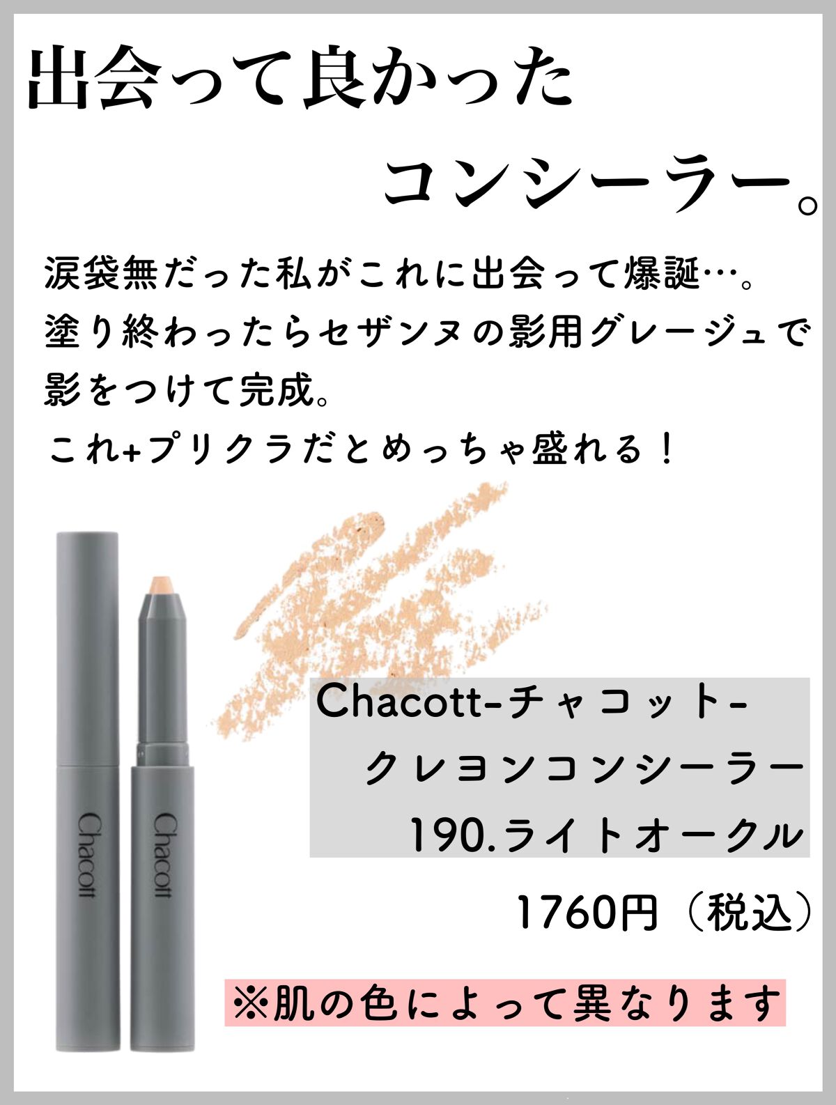 チャコット・コスメティクスクレヨンコンシーラー190 ライトオークルリップス購入品涙袋にいいかなぁ〜と買ってみたぁライトオークルで1番明るめの色ウォータープルーフ仕様で繰り出し式ペンシルコンシーラー出しても戻せるのも良き♪すごく描きやすい柔ら...