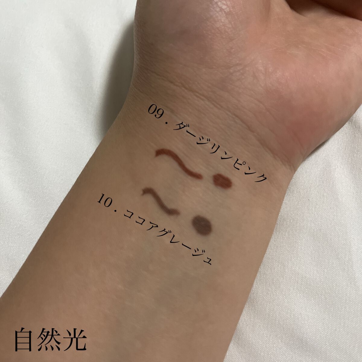 - <01 ディープブラック> メチルトリメチコン、トリメチルシロキシケイ酸、(アクリレーツ/アクリル酸ステアリル/メタクリル酸ジメチコン)コポリマー、ポリエチレン、カルナウバロウ、キャンデリラロウ、ジメチコン、水添レシチン、シリカ、メタクリル酸メチルクロスポリマー、トコフェロール、スクワラン、ホホバ種子油、マカデミア種子油、ヒアルロン酸Na、メチコン、(+/-)水酸化Al、酸化鉄、マイカ、酸化チタン <02 ミディアムブラウン> メチルトリメチコン、トリメチルシロキシケイ酸、(アクリレーツ/アクリル酸ステアリル/メタクリル酸ジメチコン)コポリマー、ポリエチレン、カルナウバロウ、キャンデリラロウ、ジメチコン、水添レシチン、シリカ、メタクリル酸メチルクロスポリマー、トコフェロール、スクワラン、ホホバ種子油、マカデミア種子油、ヒアルロン酸Na、メチコン、(+/-)水酸化Al、酸化鉄、マイカ、酸化チタン <03 ダークブラウン> メチルトリメチコン、トリメチルシロキシケイ酸、(アクリレーツ/アクリル酸ステアリル/メタクリル酸ジメチコン)コポリマー、ポリエチレン、カルナウバロウ、スクワラン、ジメチコン、水添レシチン、シリカ、トコフェロール、メタクリル酸メチルクロスポリマー、キャンデリラロウ、ホホバ種子油、マカデミア種子油、ヒアルロン酸Na、メチコン、水酸化Al、酸化鉄、酸化チタン、マイカ <04 ガーネットバーガンディ> メチルトリメチコン、トリメチルシロキシケイ酸、(アクリレーツ/アクリル酸ステアリル/メタクリル酸ジメチコン)コポリマー、ポリエチレン、カルナウバロウ、ジメチコン、キャンデリラロウ、水添レシチン、シリカ、トコフェロール、メタクリル酸メチルクロスポリマー、スクワラン、ホホバ種子油、マカデミア種子油、ヒアルロン酸Na、メチコン、水酸化Al、酸化鉄、グンジョウ、酸化チタン、マイカ <06 フォギープラム> メチルトリメチコン、トリメチルシロキシケイ酸、(アクリレーツ/アクリル酸ステアリル/メタクリル酸ジメチコン)コポリマー、ポリエチレン、カルナウバロウ、ジメチコン、キャンデリラロウ、水酸化Al、水添レシチン、シリカ、トコフェロール、メタクリル酸メチルクロスポリマー、スクワラン、ホホバ種子油、マカデミア種子油、ヒアルロン酸Na、メチコン、酸化鉄、グンジョウ、酸化チタン、マイカ <07 アズキブラウン> メチルトリメチコン、トリメチルシロキシケイ酸、(アクリレーツ/アクリル酸ステアリル/メタクリル酸ジメチコン)コポリマー、ポリエチレン、カルナウバロウ、キャンデリラロウ、ジメチコン、水添レシチン、シリカ、トコフェロール、メタクリル酸メチルクロスポリマー、スクワラン、ホホバ種子油、マカデミア種子油、水酸化Al、ハイドロゲンジメチコン、ヒアルロン酸Na、メチコン、酸化鉄、グンジョウ、マイカ、酸化チタン <09 ダージリンピンク> メチルトリメチコン、トリメチルシロキシケイ酸、(アクリレーツ/アクリル酸ステアリル/メタクリル酸ジメチコン)コポリマー、合成ワックス、カルナウバロウ、キャンデリラロウ、ジメチコン、水酸化Al、ハイドロゲンジメチコン、水添レシチン、シリカ、トコフェロール、メタクリル酸メチルクロスポリマー、スクワラン、ホホバ種子油、マカデミア種子油、ヒアルロン酸Na、メチコン、酸化鉄、酸化チタン、マイカ、グンジョウ <11 クラウディーグレー> メチルトリメチコン、トリメチルシロキシケイ酸、(アクリレーツ/アクリル酸ステアリル/メタクリル酸ジメチコン)コポリマー、合成ワックス、カルナウバロウ、ジメチコン、キャンデリラロウ、水酸化Al、水添レシチン、シリカ、トコフェロール、メタクリル酸メチルクロスポリマー、ハイドロゲンジメチコン、スクワラン、ホホバ種子油、マカデミア種子油、ヒアルロン酸Na、メチコン、酸化鉄、酸化チタン、マイカ <15 カプチーノピンク> メチルトリメチコン、トリメチルシロキシケイ酸、(アクリレーツ/アクリル酸ステアリル/メタクリル酸ジメチコン)コポリマー、合成ワックス、カルナウバロウ、ジメチコン、キャンデリラロウ、水酸化Al、水添レシチン、シリカ、トコフェロール、メタクリル酸メチルクロスポリマー、スクワラン、ホホバ種子油、マカデミア種子油、ヒアルロン酸Na、メチコン、酸化チタン、酸化鉄、マイカ <05 ビターキャラメル> メチルトリメチコン、トリメチルシロキシケイ酸、(アクリレーツ/アクリル酸ステアリル/メタクリル酸ジメチコン)コポリマー、ポリエチレン、カルナウバロウ、ジメチコン、キャンデリラロウ、水添レシチン、シリカ、トコフェロール、メタクリル酸メチルクロスポリマー、スクワラン、ホホバ種子油、マカデミア種子油、ヒアルロン酸Na、メチコン、水酸化Al、酸化鉄、マイカ、酸化チタン <08 マッチャカーキ> メチルトリメチコン、トリメチルシロキシケイ酸、(アクリレーツ/アクリル酸ステアリル/メタクリル酸ジメチコン)コポリマー、合成ワックス、