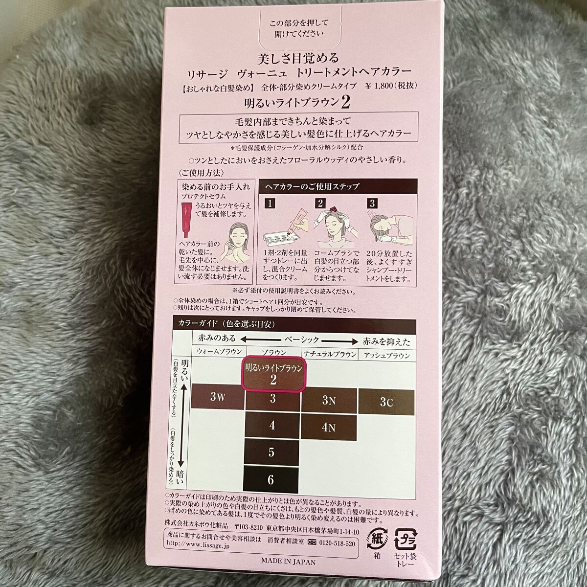 毛髪内部まできちんと染め上げます。 ヘアカラー前に使用することで、うるおいとツヤを与えて髪を補修するプロテクトセラム入り。 色落ちが少なく、染まりも満足🌟 においも強くなく、染めた後のかゆみもほぼ感じません。 普段はドラストで購入。 今回はネットで2個セットで購入しました。