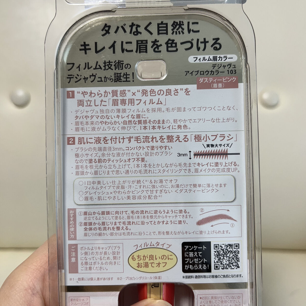 私は今真っ黒とは言わないけど暗髪ですがピンク眉でも浮く感じがありませんでした◎ ピンクみが強くってピンクブラウンよりも今流行りの【ピンク眉】が作れるなという印象。 ・発色が良い! ・先端が直径3㍉のコンパクトなブラシ⇨デジャヴュさんの推しは本当にコレ‼️1本1本綺麗に塗れて自然に仕上がるし、極小ブラシだから肌に液が付かない! ・お湯で簡単オフ⇨皮脂や汗に強くて1日中持つのに簡単にオフできる! ・ダスティーピンクはピンク×グレイッシュで甘すぎない ・素敵な限定色が多すぎ。 ・全国のバライティショップでしか買えない