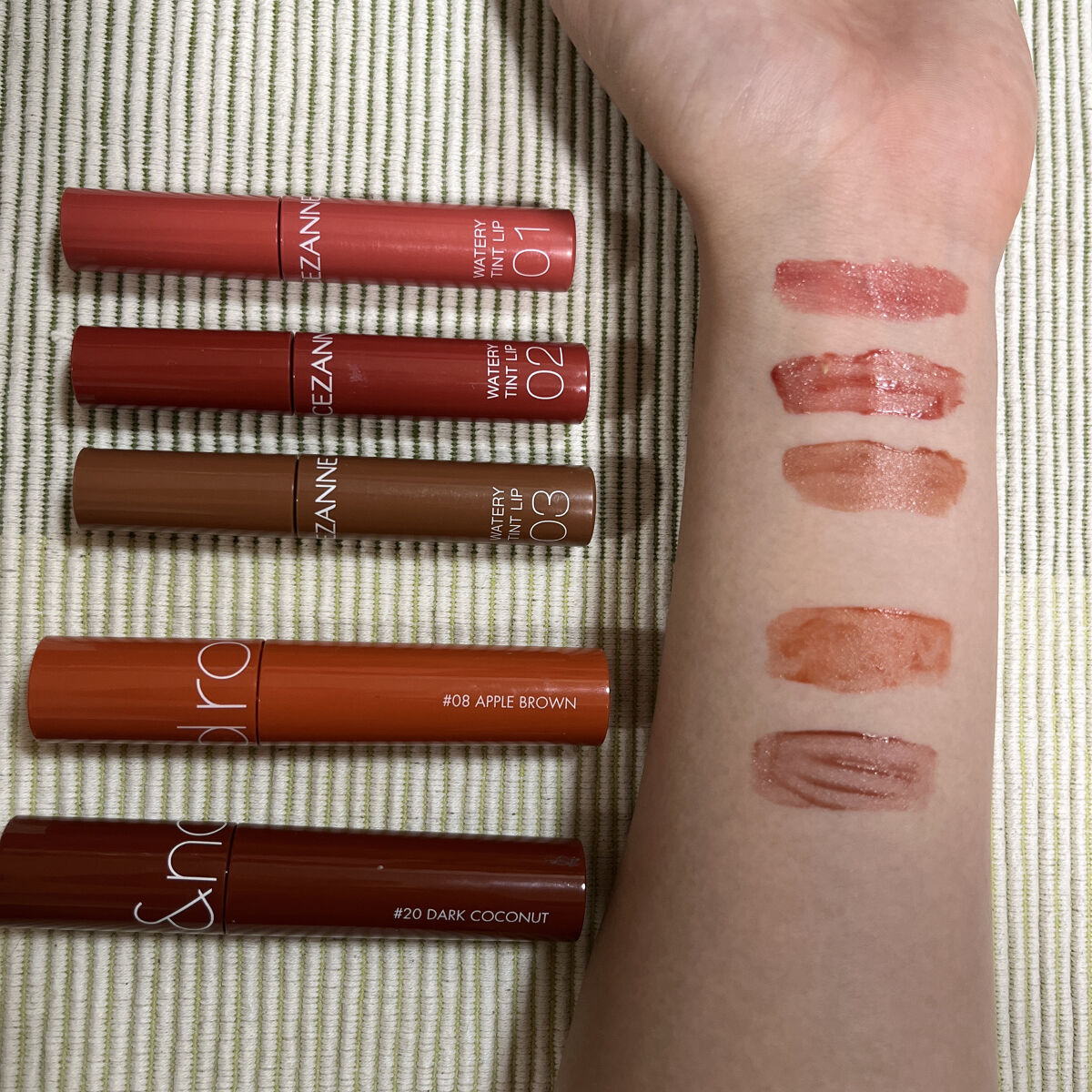 ・ティント・安い・レッドブラウン系・ツヤ系リップ・落ち具合一緒・塗り直し必要 ・rom&ndの方がサイズが大きい・ティッシュオフするとrom&ndはレッド寄りに、CEZANNEはオレンジ寄りになる・少しCEZANNEの方がナチュラルな気がする・値段はCEZANNEの勝ち・rom&ndは匂いがある、CEZANNEはあるっちゃあるけどrom&ndみたいにいい匂いではない