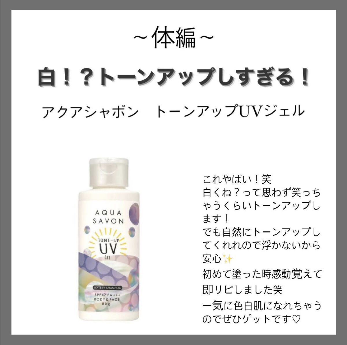 | 日焼け止め・UVケアランキング第120位 | みずみずしいテクスチャーで、伸びも良く身体全体に塗りやすいです! | 詳細を見る | |