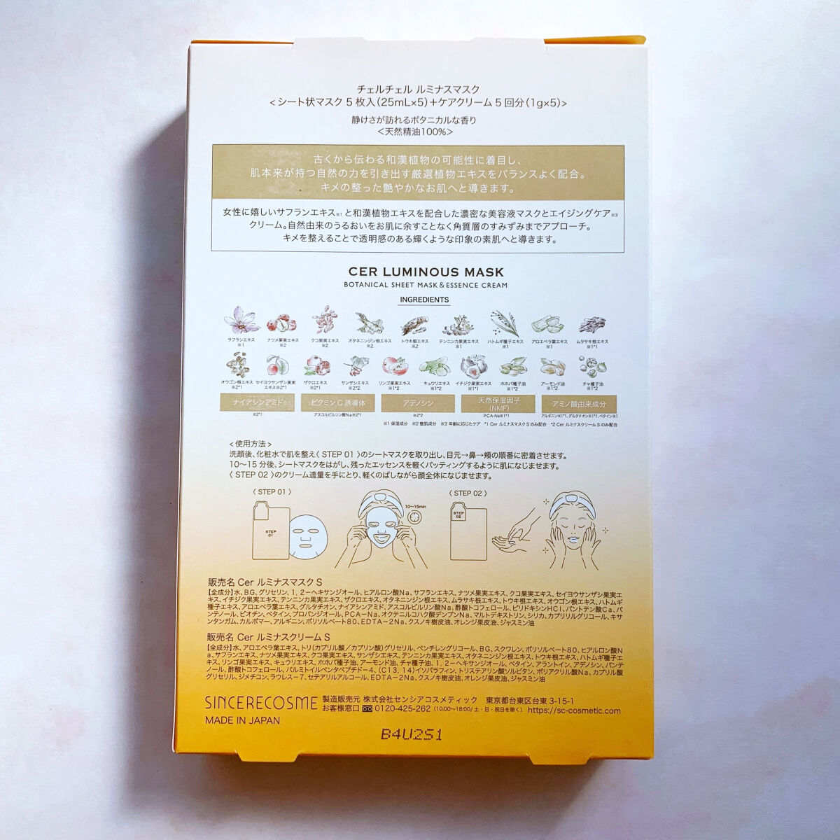 - Cer ルミナスマスク S 水、BG、グリセリン、1,2-ヘキサンジオール、ヒアルロン酸Na、サフランエキス、ナツメ果実エキス、クコ果実エキス、セイヨウサンザシ果実エキス、イチジク果実エキス、テンニンカ果実エキス、ザクロエキス、オタネニンジン根エキス、ムラサキ根エキス、トウキ根エキス、オウゴン根エキス、ハトムギ種子エキス、アロエベラ葉エキス、グルタチオン、ナイアシンアミド、アスコルビルリン酸Na、酢酸トコフェロール、ピリドキシンHCl、パントテン酸Ca、パンテノール、ビオチン、ベタイン、プロパンジオール、PCA-Na、オクテニルコハク酸デンプンNa、マルトデキストリン、シリカ、カプリリルグリコール、キサンタンガム、カルボマー、アルギニン、ポリソルベート80、EDTA-2Na、クスノキ樹皮油、オレンジ果皮油、ジャスミン油 Cer ルミナスクリーム S 水、アロエベラ葉エキス、トリ(カプリル酸/カプリン酸)グリセリル、ペンチレングリコール、BG、スクワレン、ポリソルベート80、ヒアルロン酸Na、サフランエキス、ナツメ果実エキス、クコ果実エキス、サンザシエキス、テンニンカ果実エキス、オタネニンジン根エキス、トウキ根エキス、ハトムギ種子エキス、リンゴ果実エキス、キュウリエキス、ホホバ種子油、アーモンド油、チャ種子油、1,2-ヘキサンジオール、ベタイン、アラントイン、アデノシン、パンテノール、酢酸トコフェロール、パルミトイルペンタペプチド-4、(C13,14)イソパラフィン、トリステアリン酸ソルビタン、ポリアクリル酸Na、カプリル酸グリセリル、ジメチコン、ラウレス-7、セテアリルアルコール、EDTA-2Na、クスノキ樹皮油、オレンジ果皮油、ジャスミン油