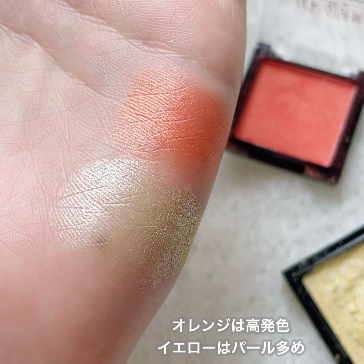 このアイシャドウは発色は薄めだけど その代わりにラメが凄くて!! なのでオレンジメイクしたいけど なかなか挑戦出来ない方とかにも◎ オレンジを単体で塗れば可愛い印象に ブラウンを加えれば大人っぽい印象に とっても可愛いアイシャドウなので 是非チェックしてみてください🍯💗
