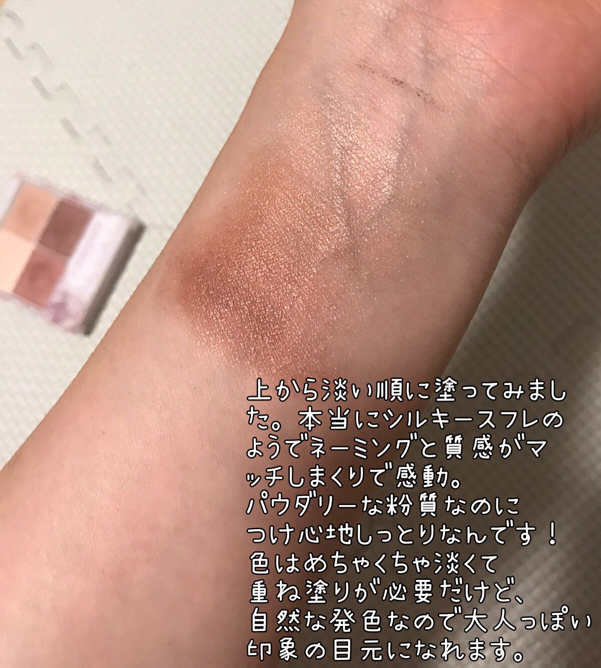 - しっとり密着!リッチな質感! 透けツヤ4色アイシャドウ シルクのようなツヤ感とスフレのようななめらかさ。 繊細なパールが配合されたやわらかなしっとりパウダーで、上品な目元に仕上がります。 ※2023年8月〜パッケージ順次リニューアル。