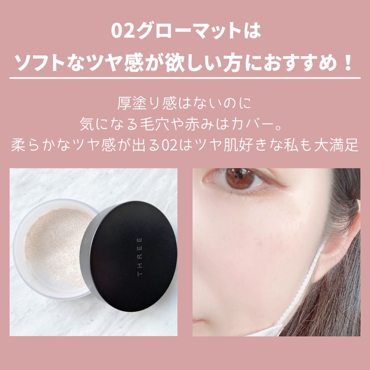 スムースマットとグローマットの2色展開ですが、ツヤ肌が好きなのでグローマットを選択しました。 ギラギラとしたツヤ肌!!といった感じではなく、ほんのり自然に光を与えてくれる感じ。 粉っぽさや厚塗り感は全然感じないのに、触るとサラサラとしている感じ! 細かい粒子のパウダーなので肌なじみもよく、塗った印象はまさに「消えてる…!」適当に塗るだけでもサラサラ・厚ぼったくならないのがイイ💮