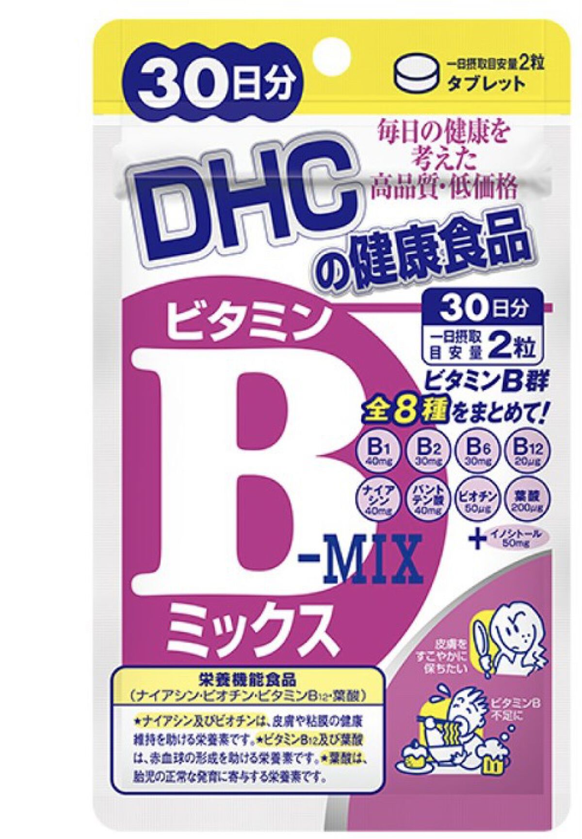 - ビタミンB群は、糖分やたんぱく質などの栄養素をエネルギーにかえる必須ビタミン。 美容やスタミナ、ダイエット中の栄養補給などに欠かせないビタミンB1、B2、B6、B12、ナイアシン、パントテン酸、ビオチン、葉酸のビタミンB群全8種類にイノシトールを、バランスよく配合しました。 栄養機能表示 ●ビタミンB12及び葉酸は、赤血球の形成を助ける栄養素です。 ●ナイアシン及びビオチンは、皮膚や粘膜の健康維持を助ける栄養素です。 ●葉酸は、胎児の正常な発育に寄与する栄養素です。 ※葉酸は、胎児の正常な発育に寄与する栄養素ですが、多量摂取により胎児の発育が良くなるものではありません。 ※水またはぬるま湯で噛まずにそのままお召し上がりください。 ※本品は、多量摂取により疾病が治癒したり、より健康が増進するものではありません。一日の摂取目安量を守ってください。 ※本品は、特定保健用食品と異なり、消費者庁長官による個別審査を受けたものではありません。 ※原料の性質上、斑点が生じたり、色調に若干差が見られる場合がありますが、品質に問題はありません。 【名称】 ビタミンB群含有食品 【原材料名】 澱粉(国内製造)/セルロース、イノシトール、パントテン酸Ca、ビタミンB1、ナイアシン、ビタミンB6、ビタミンB2、微粒二酸化ケイ素、ステアリン酸Ca、セラック、葉酸、ビオチン、ビタミンB12 【飲み方】 一日の摂取目安量2粒 【栄養成分表示[2粒400mgあたり]】 熱量1.6kcal、たんぱく質0.15g、脂質0.01g、炭水化物0.22g、食塩相当量0.0004g、ビタミンB1 40.0mg、ビタミンB2 30.0mg、ビタミンB6 30.0mg、ビタミンB12 20.0μg(833)、ナイアシン40mg(308)、パントテン酸40.0mg、ビオチン50μg(100)、葉酸200μg(83)、イノシトール50mg ※上記( )内の値は、栄養素等表示基準値(18歳以上、基準熱量2200kcal)に占める割合[%]です。 ※一日の目安量を守って、お召し上がりください。 ※お身体に異常を感じた場合は、摂取を中止してください。 ※特定原材料及びそれに準ずるアレルギー物質を対象範囲として表示しています。原材料をご確認の上、食物アレルギーのある方はお召し上がりにならないでください。 ※薬を服用中あるいは通院中の方、妊娠中の方は、お医者様にご相談の上お召し上がりください。 ●直射日光、高温多湿な場所をさけて保存してください。 ●お子様の手の届かないところで保管してください。 ●開封後はしっかり開封口を閉め、なるべく早くお召し上がりください。 食生活は、主食、主菜、副菜を基本に、食事のバランスを。