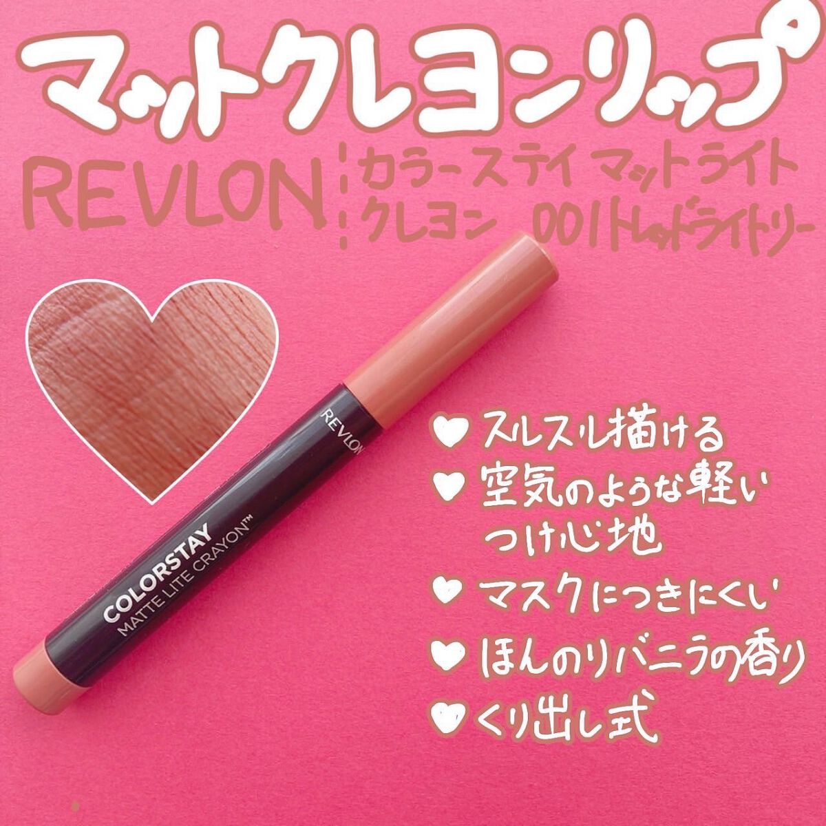 - スルスル描けて、空気のような、軽いつけ心地!超軽*¹!クレヨンリップ 『レブロン カラーステイ マット ライト クレヨン』が登場。 1.するする描けて、ふわっと軽い! まるで天使の羽⁉ 極軽の仕上がりを叶える、ライト インフュージョン コンプレックス*² 処方 2.マスクに、つきにくい! ピタッと密着。サラサラなつけ心地。 3.肌になじむ、自然なマット仕上り! くすみ系カラー&自然なマット質感で、こなれた唇に。 ・ スリムで塗りやすい、クレヨンリップ ・ ほんのりバニラの香り ・ シャープナー付き「くり出し式」 *¹ 従来自社リップスティック製品より30%減の軽さ(同じ塗布方法において) *² コンディショニング成分:マンゴー種子油、シリカ、カプリリルメチコン たくさんのご応募お待ちしております♪