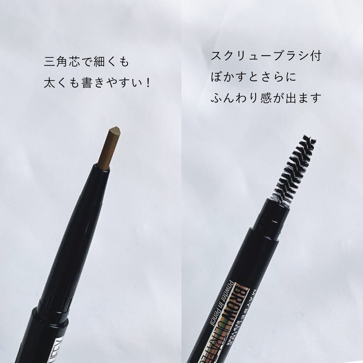- <2020年3月14日「ファッションブロウ パウダーインペンシル」から「ファッションブロウ パウダーインペンシル N」に名称変更> パウダーのようなふんわり自然な仕上がりなのに、眉毛にしっかり密着、落ちにくい。長時間*²、自然な仕上がりをキープしてくれます。汗・水にも強いウォータープルーフタイプ。 ■1本で様々なラインが自由自在に描ける三角カット芯 角:眉尻もラクラク描き足せる。 表面:眉頭や眉全体に自然な立体感を。 ■・密着パウダー成分配合 描くだけでパウダーのようなふんわりぼかした印象に。しかも眉毛に密着するから長時間*² 仕上がりキープ。 *2 メイベリン ニューヨーク調べ(個人差があります)。
