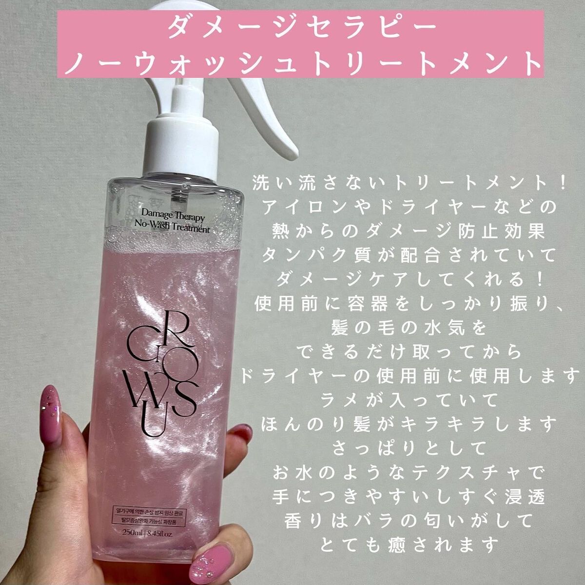 見た目の可愛さたまらん🥺💓ダメージヘアをツヤ髪に生まれ変わらせる洗い流さないヘアトリートメントをご紹介🫶@growus.jp様のダメージセラピーノーウォッシュトリートメントEX🧴細かいキラキラの粒子が入ったスプレー型トリートメント💜ダメージ補...