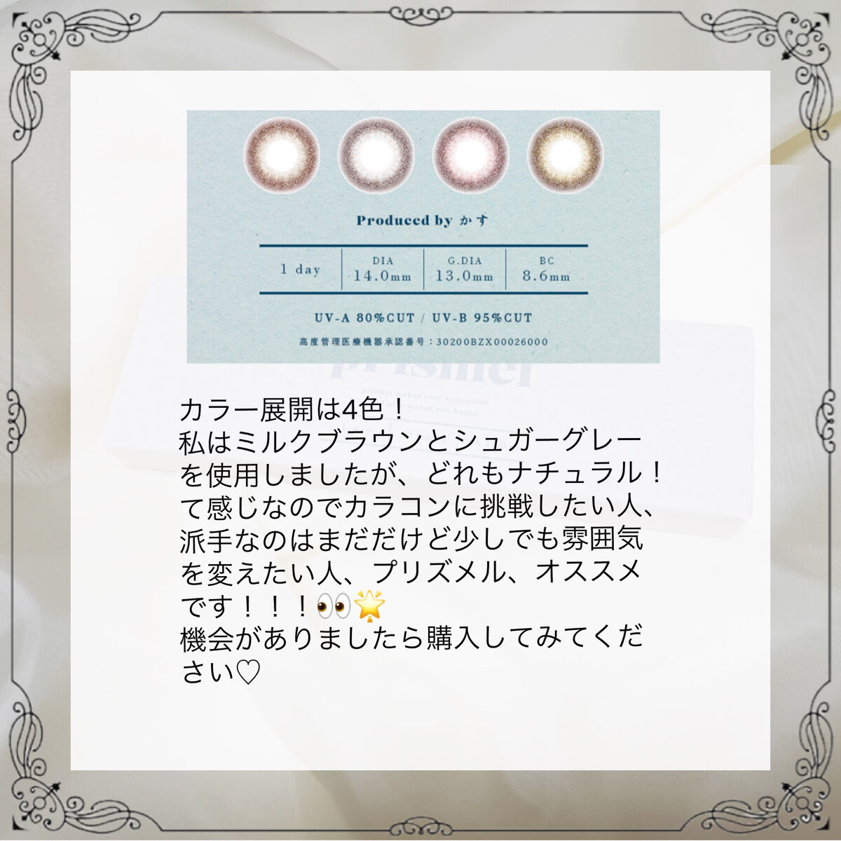- 美しすぎるYouTuber”かす”ちゃんプロデュース『プリズメル』 溶けこむように自然な透明感あふれる小さめレンズ。 普段使いできるUVカット付きのナチュラルな7カラー♪