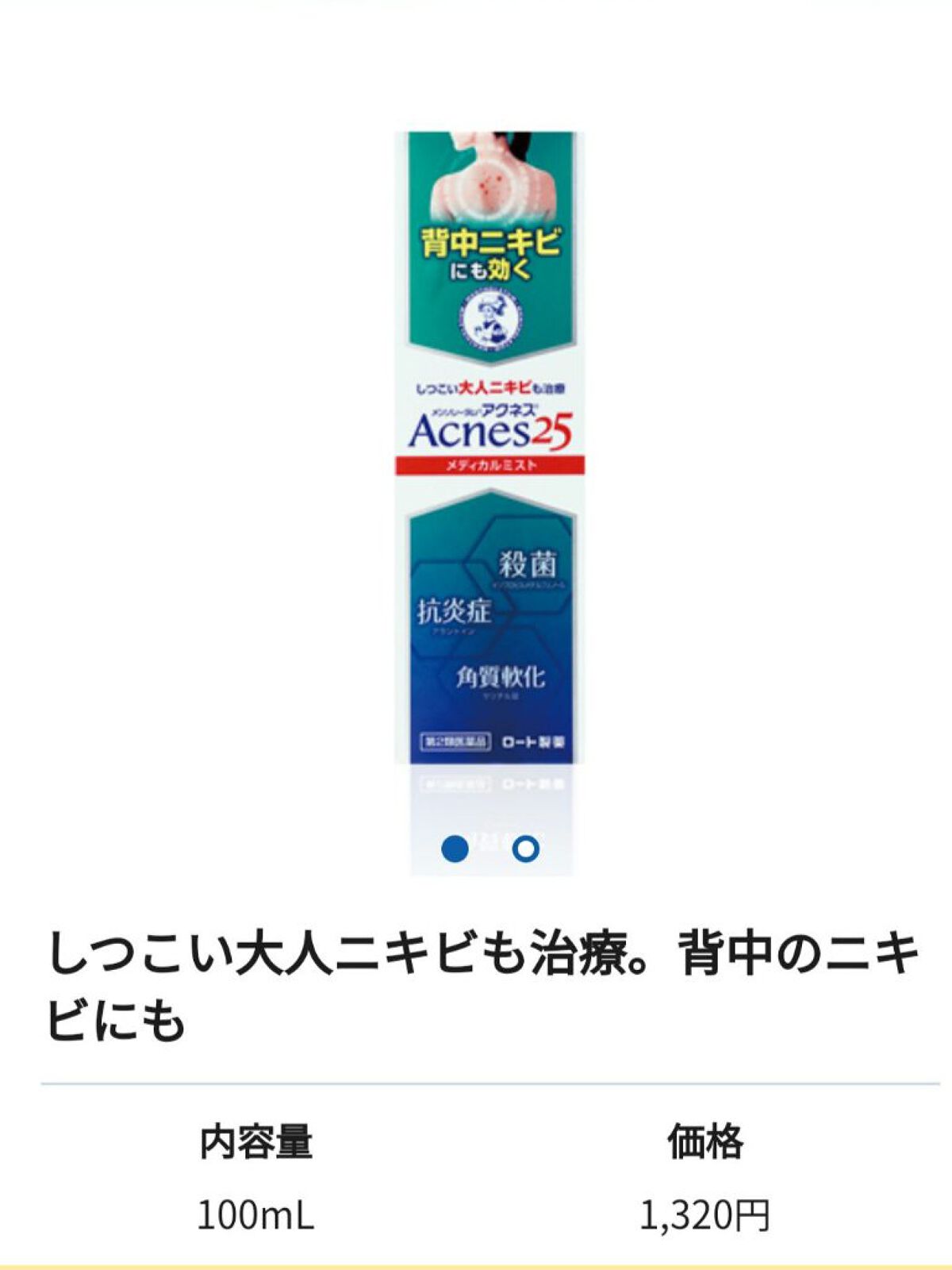 - 思春期のニキビと異なり大人のニキビは、肌の乾燥やストレス、ホルモンバランスの乱れなども原因であると言われています。「メンソレータムアクネス25メディカルミストb」は、大人のニキビに着目した治療薬です。 イソプロピルメチルフェノール(殺菌成分)がアクネ菌の巣(バイオフィルム)を壊して、アクネ菌を殺菌!アラントイン(抗炎症成分)がニキビの炎症をしずめ、傷ついた組織を修復。サリチル酸(角質軟化作用)で古い角質を取り除き、つまった毛穴を開き、ニキビを治療します。 うるおい成分配合。オイルフリー。無着色。薬効感のある爽やかな香り。ボトルを逆さまにしても使えます。手の届きにくい背中などにも使いやすいミストタイプ。