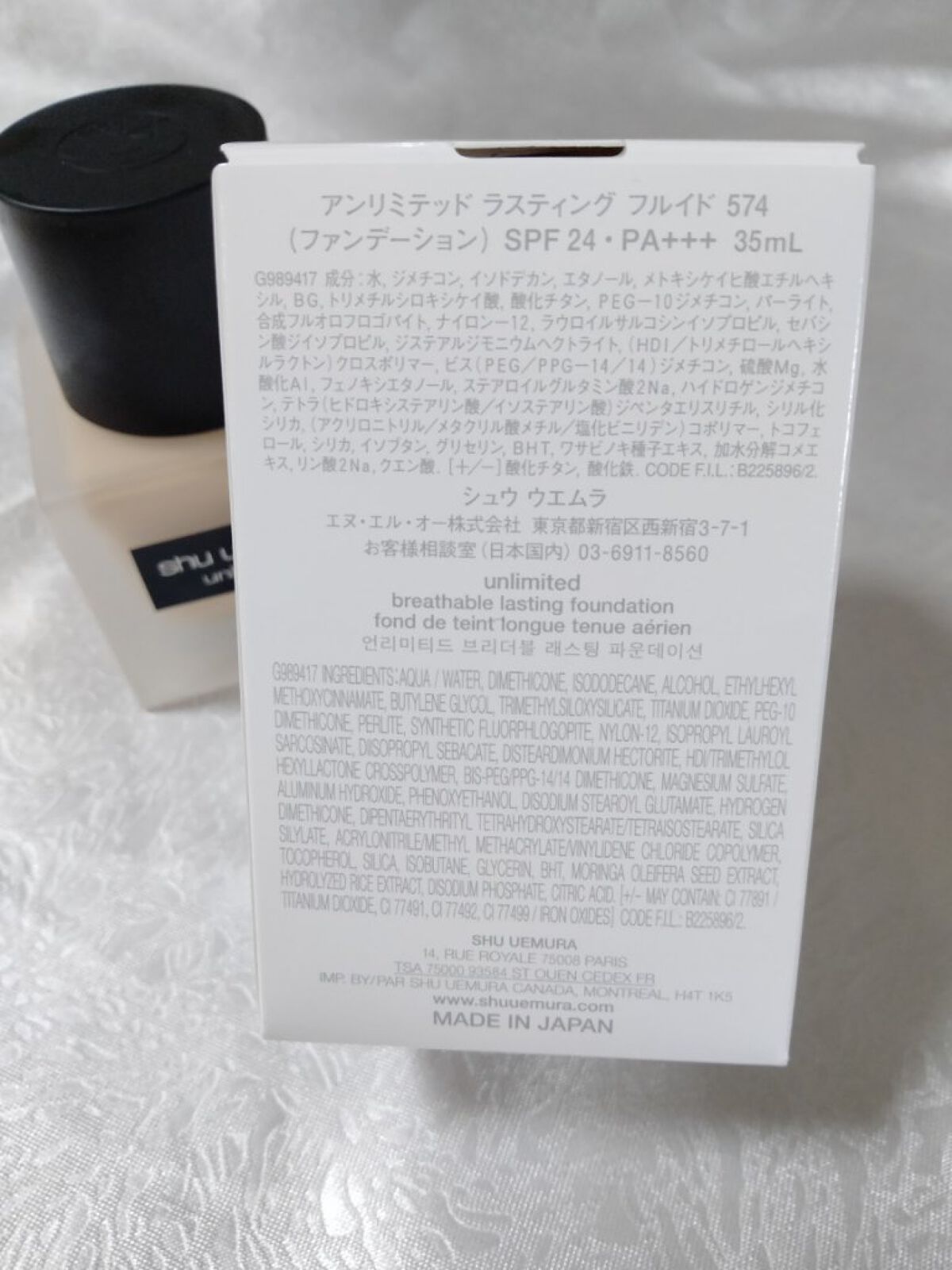 - <375> 水、ジメチコン、イソドデカン、エタノール、メトキシケイヒ酸エチルヘキシル、BG、トリメチルシロキシケイ酸、酸化チタン、PEG-10ジメチコン、パーライト、合成フルオロフロゴバイト、ナイロン-12、ラウロイルサルコシンイソプロピル、セバシン酸ジイソプロピル、ジステアルジモニウムヘクトライト、(HDI/トリメチロールヘキシルラクトン)クロスポリマー、ビス(PEG/PPG-14/14)ジメチコン、硫酸Mg、水酸化AI、フェノキシエタノール、ステアロイルグルタミン酸2Na、ハイドロゲンジメチコン、テトラ(ヒドロキシステアリン酸/イソステアリン酸)ジベンタエリスリチル、シリル化シリカ、(アクリロニトリル/メタクリル酸メチル/塩化ビニリデン) コポリマー、トコフェロール、シリカ、イソブタン、グリセリン、BHT、ワサビノキ種子エキス、加水分解コメエキス、リン酸2Na、クエン酸、〔+/-〕酸化チタン、酸化鉄 <453> 水、ジメチコン、イソドデカン、エタノール、メトキシケイヒ酸エチルヘキシル、BG、トリメチルシロキシケイ酸、酸化チタン、PEG-10ジメチコン、パーライト、合成フルオロフロゴバイト、ナイロン-12、ラウロイルサルコシンイソプロピル、セバシン酸ジイソプロピル、ジステアルジモニウムヘクトライト、(HDI/トリメチロールヘキシルラクトン)クロスポリマー、ビス(PEG/PPG-14/14)ジメチコン、硫酸Mg、水酸化AI、フェノキシエタノール、ステアロイルグルタミン酸2Na、ハイドロゲンジメチコン、テトラ(ヒドロキシステアリン酸/イソステアリン酸)ジベンタエリスリチル、シリル化シリカ、(アクリロニトリル/メタクリル酸メチル/塩化ビニリデン) コポリマー、トコフェロール、シリカ、イソブタン、グリセリン、BHT、ワサビノキ種子エキス、加水分解コメエキス、リン酸2Na、クエン酸、〔+/-〕酸化チタン、酸化鉄 <463> 水、ジメチコン、イソドデカン、エタノール、メトキシケイヒ酸エチルヘキシル、BG、トリメチルシロキシケイ酸、酸化チタン、PEG-10ジメチコン、パーライト、合成フルオロフロゴバイト、ナイロン-12、ラウロイルサルコシンイソプロピル、セバシン酸ジイソプロピル、ジステアルジモニウムヘクトライト、(HDI/トリメチロールヘキシルラクトン)クロスポリマー、ビス(PEG/PPG-14/14)ジメチコン、硫酸Mg、水酸化AI、フェノキシエタノール、ステアロイルグルタミン酸2Na、ハイドロゲンジメチコン、テトラ(ヒドロキシステアリン酸/イソステアリン酸)ジベンタエリスリチル、シリル化シリカ、(アクリロニトリル/メタクリル酸メチル/塩化ビニリデン) コポリマー、トコフェロール、シリカ、イソブタン、グリセリン、BHT、ワサビノキ種子エキス、加水分解コメエキス、リン酸2Na、クエン酸、〔+/-〕酸化チタン、酸化鉄 <474> 水、ジメチコン、イソドデカン、エタノール、メトキシケイヒ酸エチルヘキシル、BG、トリメチルシロキシケイ酸、酸化チタン、PEG-10ジメチコン、パーライト、合成フルオロフロゴバイト、ナイロン-12、ラウロイルサルコシンイソプロピル、セバシン酸ジイソプロピル、ジステアルジモニウムヘクトライト、(HDI/トリメチロールヘキシルラクトン)クロスポリマー、ビス(PEG/PPG-14/14)ジメチコン、硫酸Mg、水酸化AI、フェノキシエタノール、ステアロイルグルタミン酸2Na、ハイドロゲンジメチコン、テトラ(ヒドロキシステアリン酸/イソステアリン酸)ジベンタエリスリチル、シリル化シリカ、(アクリロニトリル/メタクリル酸メチル/塩化ビニリデン) コポリマー、トコフェロール、シリカ、イソブタン、グリセリン、BHT、ワサビノキ種子エキス、加水分解コメエキス、リン酸2Na、クエン酸、〔+/-〕酸化チタン、酸化鉄 <484> 水、ジメチコン、イソドデカン、エタノール、メトキシケイヒ酸エチルヘキシル、BG、トリメチルシロキシケイ酸、酸化チタン、PEG-10ジメチコン、パーライト、合成フルオロフロゴバイト、ナイロン-12、ラウロイルサルコシンイソプロピル、セバシン酸ジイソプロピル、ジステアルジモニウムヘクトライト、(HDI/トリメチロールヘキシルラクトン)クロスポリマー、ビス(PEG/PPG-14/14)ジメチコン、硫酸Mg、水酸化AI、フェノキシエタノール、ステアロイルグルタミン酸2Na、ハイドロゲンジメチコン、テトラ(ヒドロキシステアリン酸/イソステアリン酸)ジベンタエリスリチル、シリル化シリカ、(アクリロニトリル/メタクリル酸メチル/塩化ビニリデン) コポリマー、トコフェロール、シリカ、イソブタン、グリセリン、BHT、ワサビノキ種子エキス、加水分解コメエキス、リン酸2Na、クエン酸、〔+/-〕酸化チタン、酸化鉄 <534> 水、ジメチコン、イソドデカン、エタノール、メトキシケイヒ酸エチルヘキシル、BG、トリメチルシロキシケイ酸、酸化チタン、PEG-10ジメチコン、パーライト、合成フルオロフロゴバイト、ナイロン-12、ラウロイルサルコシンイソプロピル、セバシン酸ジイソプロピル、ジステアルジモニウムヘクトライト、(HDI/トリメチロールヘキシルラクトン)クロスポリマー、ビス(PEG/PPG