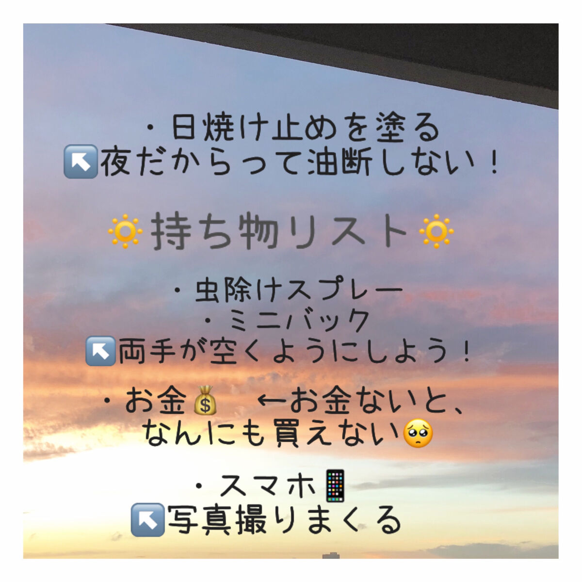 ・ムダ毛処理をする夜でもムダ毛は、見える👀 ・スマホの充電を100%にしておく^^*充電消えたら、悲しすぎるっ! ・虫除けスプレーをすることを忘れない!↖️忘れるとめっちゃ蚊に狙われるw (経験談w) ・ラメ多めのメイク↖️周りが暗いからナチュラルメイクだと見えないので、ラメ多めのメイクをする! ・日焼け止めを塗る↖️夜だからって油断しない! ・虫除けスプレー・ミニバック↖️両手が空くようにしよう! ・お金💰お金がないと、なんにも買えない🥺 ・スマホ📱↖️写真撮りまくる