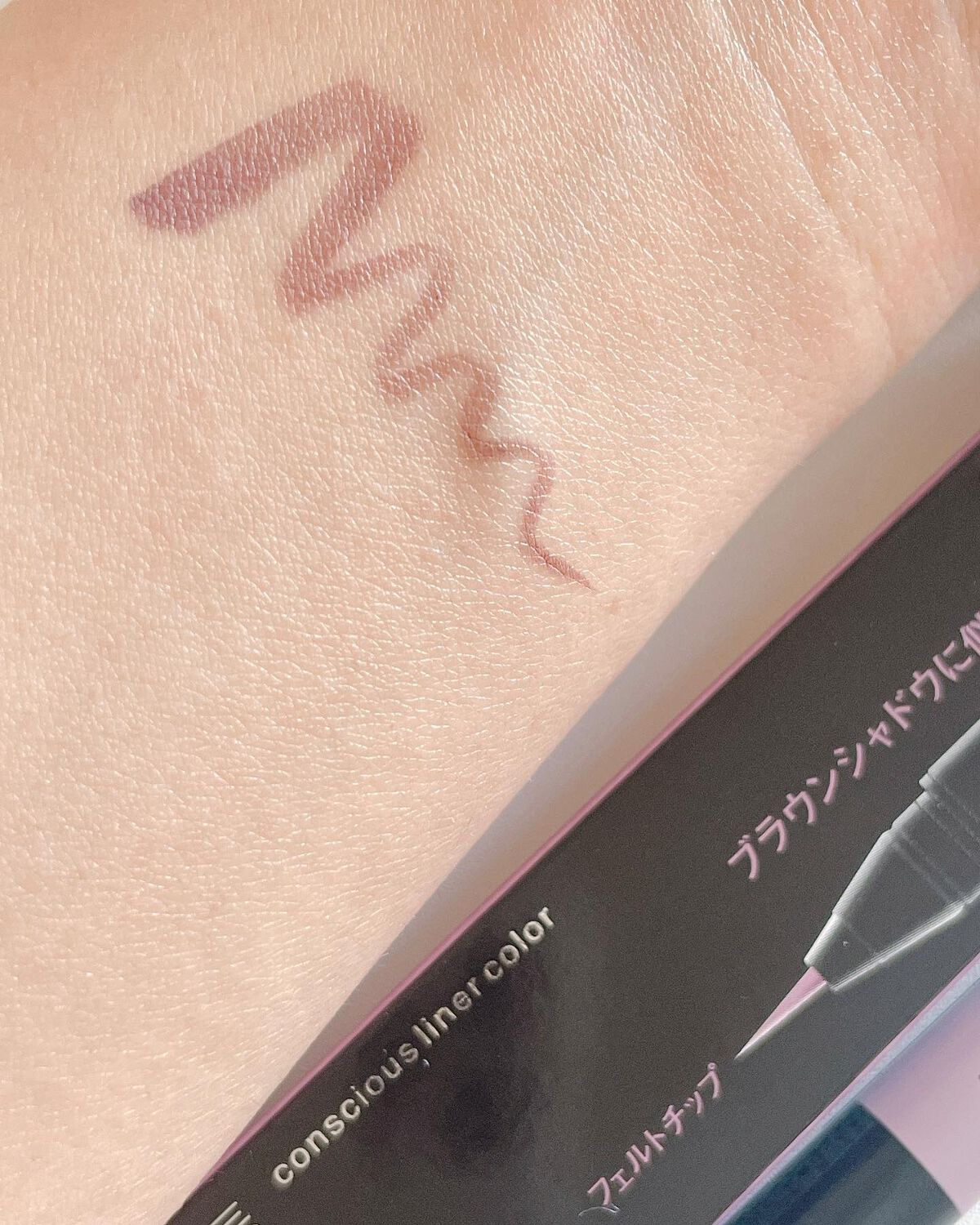 液含みのいいフェルトチップです。にじみにくくこすっても全然落ちませんがお湯オフタイプなのでお湯で簡単に落ちます。 ブラウンとラベンダーが混ざってくすみのある落ち着いた、でも少しかわいさもある色味です。 発色はよくて派手にならずにどの色のアイシャドウとでも合うと思います。