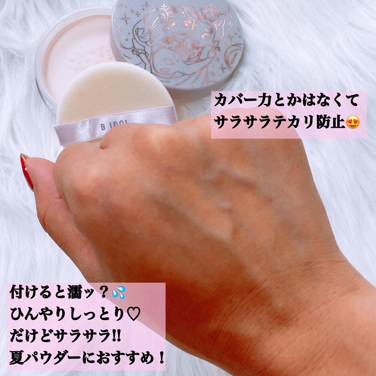 - シルクアイスパウダーディズニー限定デザイン(数量限定 ※無くなり次第終了) “ 近づきたいほど、ひんやり、さらさら。” B IDOLから数量限定、ひんやり気持ちいいフェイスパウダーが ディズニー限定デザインで新登場です。 シルクのようにさらっとまとい、アイスのようにひんやり気持ちいい。 水分含有49%のウォーターインパウダー。 夏のベタベタにも、マスク蒸れにも大活躍してくれるアイテムです。 【POINT】 ・アリエル×ラプンツェル×ティアナ限定デザイン ・持ち運びにも便利な薄型形状 ・水分含有49%。美容成分(※)配合で余分な皮脂や油分を吸着。 ・ほんのりピンクのパウダーで血色感アップ! ・微粒子パウダーが密着してサラサラに。 ・タルクフリー、石鹸オフOK ※ カニナバラ果実油、ヤマザクラ花エキス、セージ水、ハス花水、ダマスクバラ花水、ヒアルロン酸Na(保湿成分)