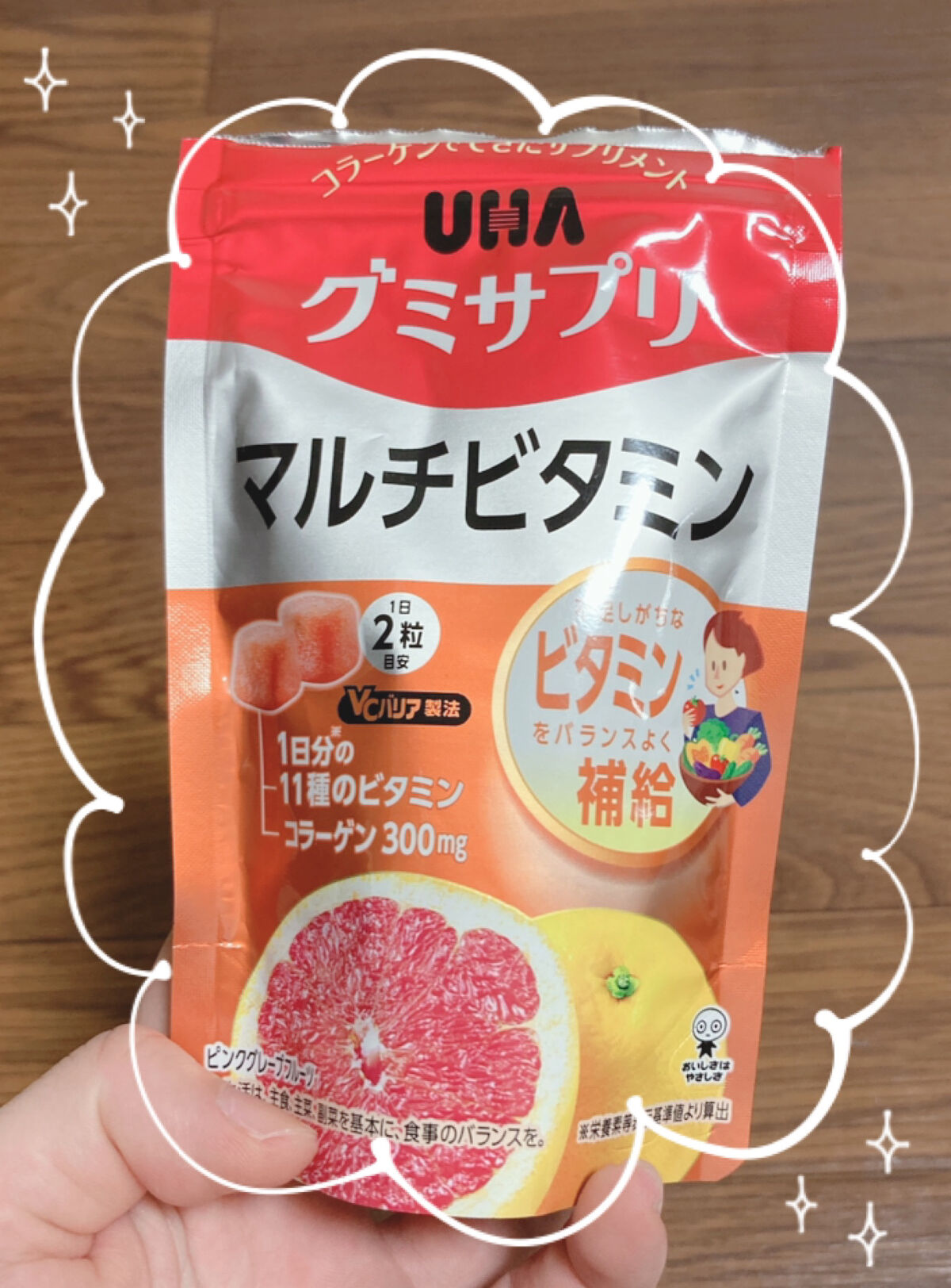 サプリメントはグミでとります。そうでないと続かないので。 UHA味覚糖のマルチビタミンはピンクグレープフルーツ味でおいしいです。少し硬めのグミです。 両方とも美味しいので続けられます。
