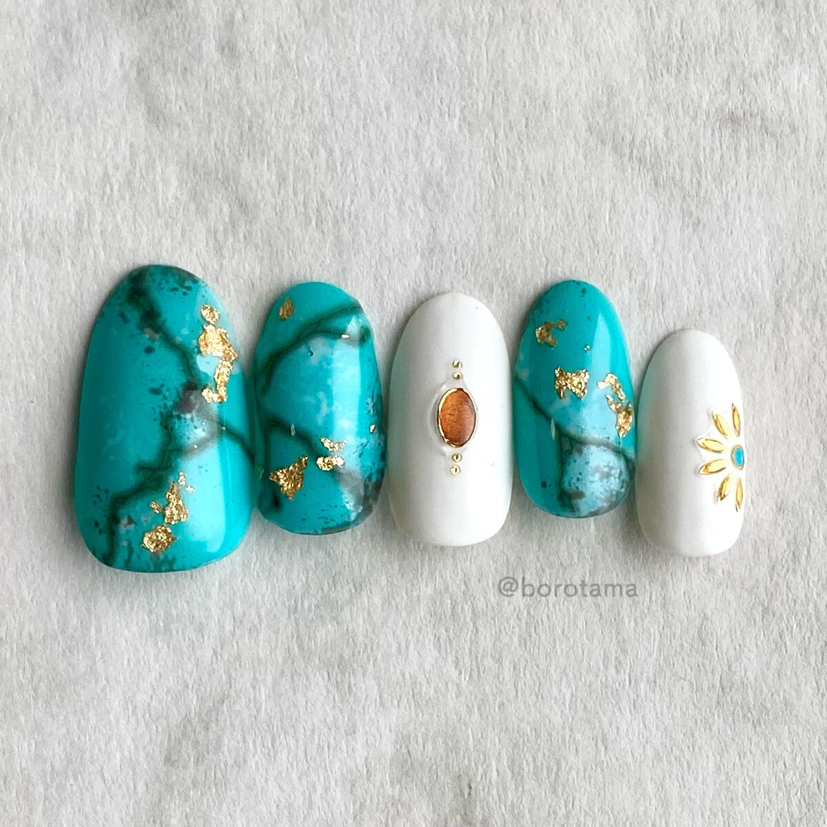 ダイソーの330円硬化ネイルシール!冬に発売された中からグリーンを使ってみました!パッケージの写真よりもやや青みが強め。天然石風で涼しげな雰囲気でした!春夏でも使いやすそうなデザインでした😊自然光だと約2時間ほどで硬化できます!夜貼って寝てい...