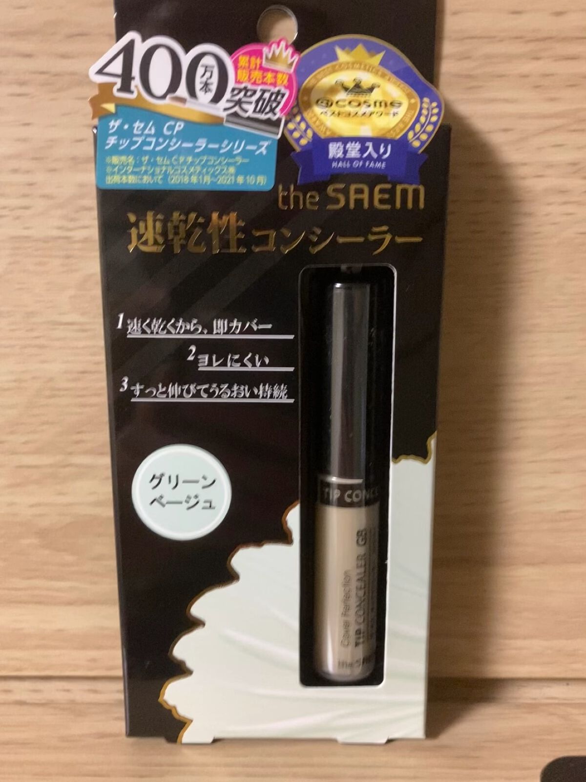 theSAEMカバーパーフェクションチップコンシーラーグリーンベージュザセムのコンシーラーはずっとリピートしていて、グリーンベージュは下地を塗った後ニキビ跡などの赤み消し用に使用チップは大きめでしっかり多めにつくので、細かい塗布は難しい緑色で...