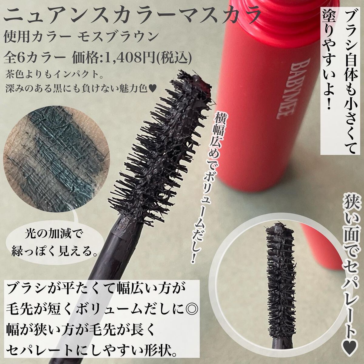 前回も投稿したんだけど(10/11の投稿です✍️)ぎゅんぎゅん伸びるのは知っていて、今回の新色も楽しみにしてた… その時にダークブラウンとかあったらいいなって言ってたんだけど…発売されちゃった👏アリガトウゴザイマス たそがれブラウンって名前にぴったりな少し赤みのあるブラウン✨ ブラック同様、繊維なしなのに一度塗りでしっかりのびる〜👀⤴︎ マスカラのブラシが不思議な形で(毎回食肉植物に見える。笑)アーチ状に並んだ5列のコームが目頭、目尻のまつ毛までしっかりキャッチしてくれるよ✨ 塗り重ねるごとに長さは出るんだけど重ねると多少ダマ?塊?みたいのが私は気になって(ならないって人もいるから塗り方が悪いのかな😂)ピンセットで整えてるよ✨! 02 たそがれブラウン 赤みブラウンで抜け感も出せて優しい目元になる✨ しかも絶妙なブラウンだから際立ち感もある。気分や、メイクによって使い分けするのもいいかも🥺✨