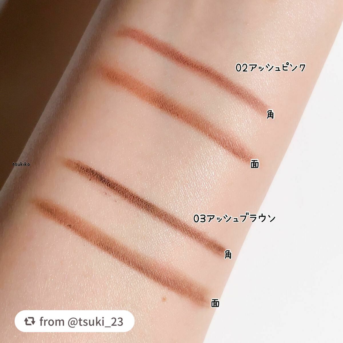 - 描き足しながらぼかせる。 ペンシルとパウダーを一つの芯にまとめた 2層芯アイブロウ ●しずく型2色グラデ芯で、自眉となじむ自然な仕上がり ー角の濃いカラーで、1本1本毛を描き足せるような細いラインを実現 ー面の淡いカラーで、自然にぼかしたような仕上がりを実現 ●毛流れを整え、自然になじませるスクリューブラシつき ●ウォータープルーフ処方 ●汗、皮脂、こすれに強く、美しい仕上がりが長時間持続 ●トリートメント成分配合 ースクワラン ●無香料 ●アレルギーテスト済(すべての方にアレルギーが起きないというわけではありません) <使い方> ●芯を2mm程度繰り出してお使いください。 ●芯の角で眉毛を1本1本描き足し、眉頭や輪郭は芯の面の部分でなじませるようにぼかします。 ●芯の出しすぎや落下などの衝撃により折れることがありますのでご注意ください。 ●ご使用後は、芯をもとにくり戻しキャップをきちんとしめてください。 ●ブラシはいつも清潔にしてお使いください。 ●日のあたるところや高温のところにおかないでください。 ●まれに芯の表面に白い粉のようなものがみられますが、品質上問題はありません。