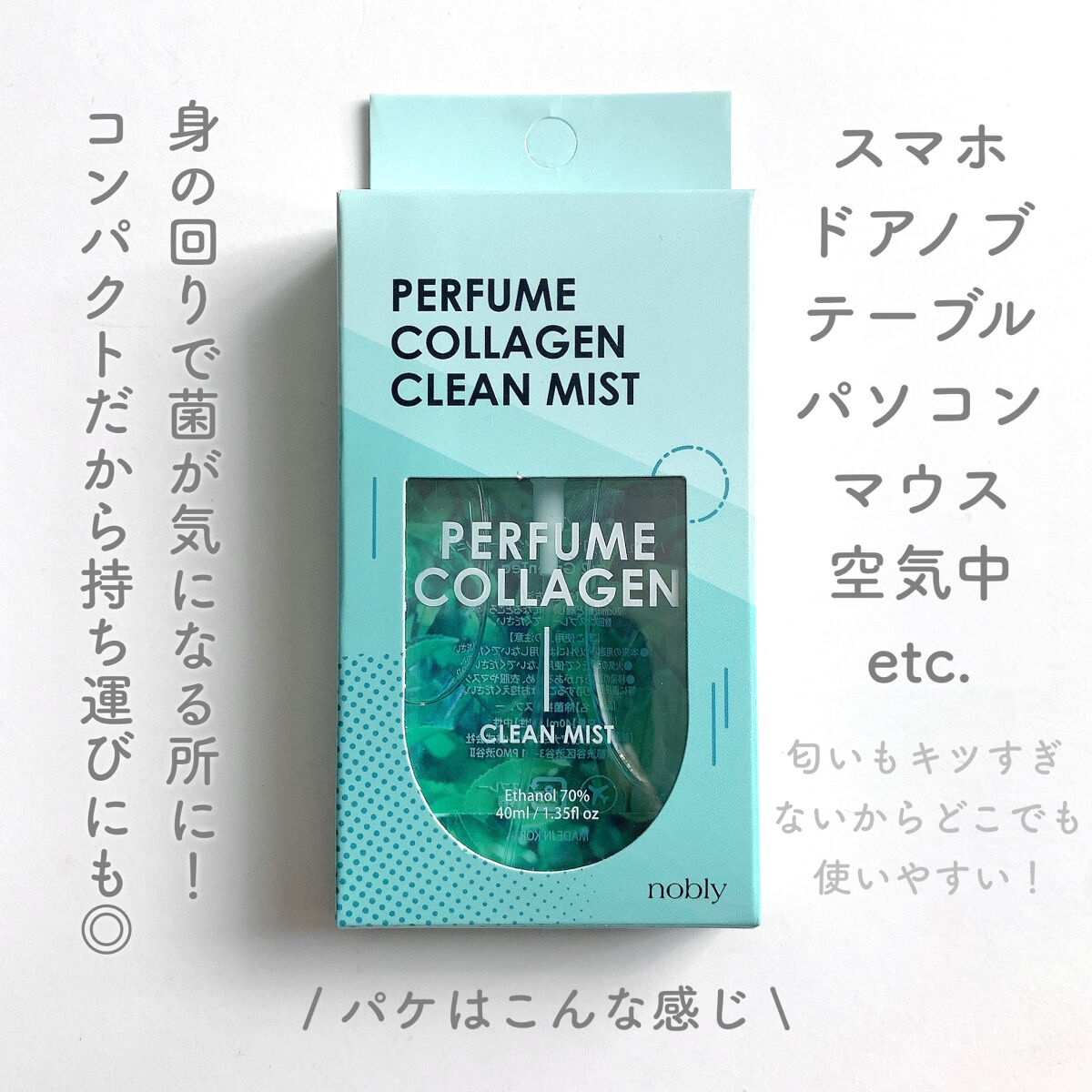 思わずパケ買いしたくなる香水のようなデザインだけでなくほのかな優しい香りが除菌剤のイメージを一新。 エタノール濃度70%でしっかり除菌!だけど強すぎないし、アルコールのにおいが気になる人にもおすすめのいい香り。 除菌を頻繁に行うと気になる乾燥。コラーゲンとヒアルロン酸配合で気になりにくいしむしろ香りが良すぎて使いたくなる。 そして片手にすっぽり収まるコンパクトでスタイリッシュなパッケージで機内にも持ち込めるそうです! ハンドジェルだとぬるぬるベタついたりするものがあるけどそういうこともないのでスマホとかデスク周りの小物とかちょっとしたものの除菌にも使いやすくておすすめです。