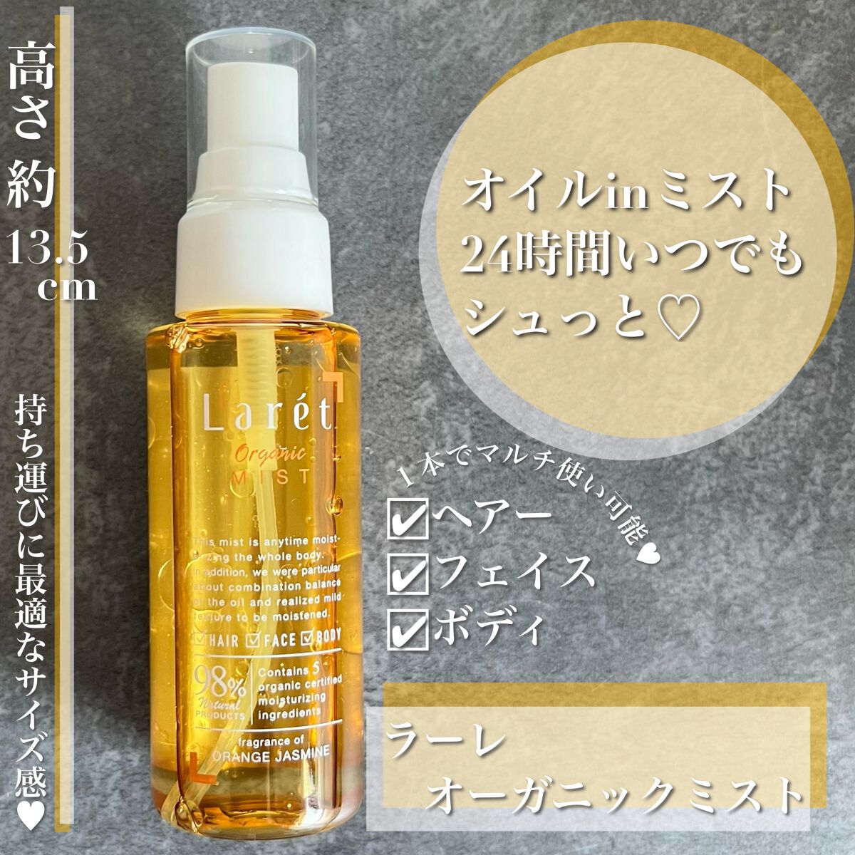 Larét(ラーレ) オーガニックミストのレビューです😄天然オイルinミストでよく振ってから髪や顔にシュっと吹きかけるんだけど、ミストが細かく出るから顔に使うときに化粧崩れを心配しなくて良いところが気に入りました👍️😎手が汚れずに、一度に広範...
