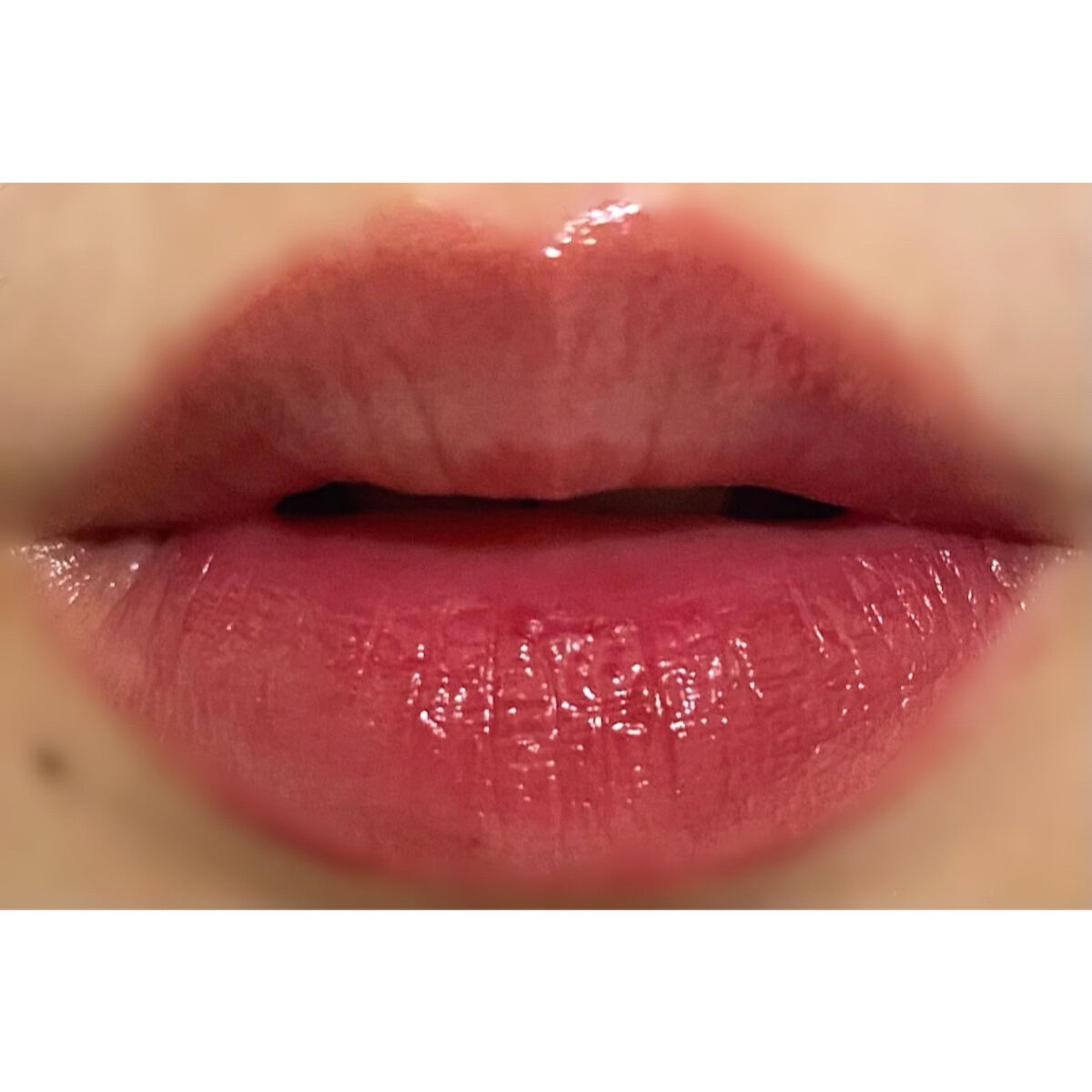 発色は一度塗りだと透け感がある感じで 重ねれば重ねるだけよく発色します。 ツヤ感のあるリップでスルスルと塗れます。 ツヤ仕上がりでティントでもないので 色持ちは喋ってるだけで一瞬で落ちるというわけではないですが 飲食をしたら普通に落ちますし マスクにもつきます。 個人的にこのリップで苦手なのはにおいです。 我慢できないほどではないのですが THE化粧品といいますか マダム感といいますか..