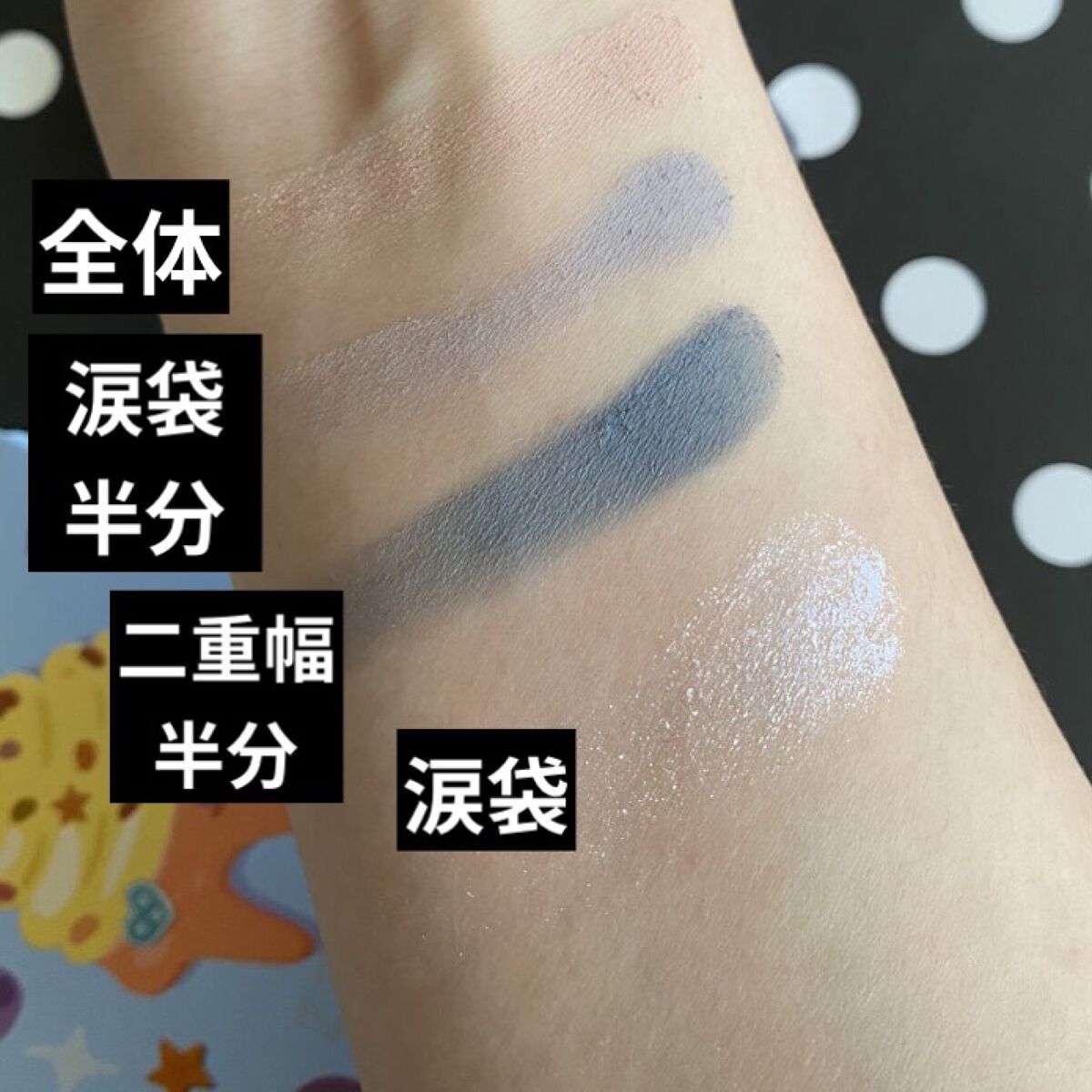 お値段500円。前回は多色のアイシャドウパレットを紹介しましたが、今回は4色入りのスタンダードなタイプ。 中を開けてみるとアイシャドウに星、ドーナツ、カラースプレーの絵が彫ってあります。 粉質は前回のアイシャドウ同様しっとりしてて粉飛び知らず。チャイボーグメイクなど濃いメイクしてる私にはぴったりのアイシャドウです。