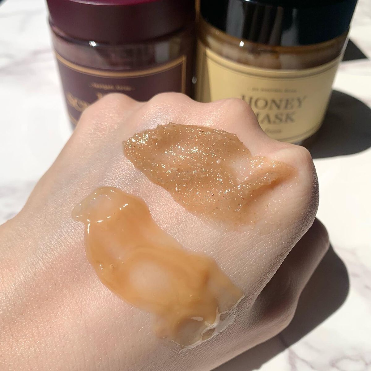 つるすべ肌でやみつきの手触りに🍯🫧 保湿には天然はちみつが持つ深い栄養でハリのあるお肌へと導いてくれるハニーマスク🍯 とろりとしていて本物のはちみつみたい! 角質ケアにはイチジク酵素と黒砂糖スクラブのフィグスクラブマスク❤️ スクラブが細かくてお顔に使いやすい!つるすべな使用感でメイクノリが良かった🥰 ハニーマスクとフィグスクラブマスクを1:1で混ぜて使用すれば 保湿ケアと角質ケアができるからW使いがオススメだよ✨
