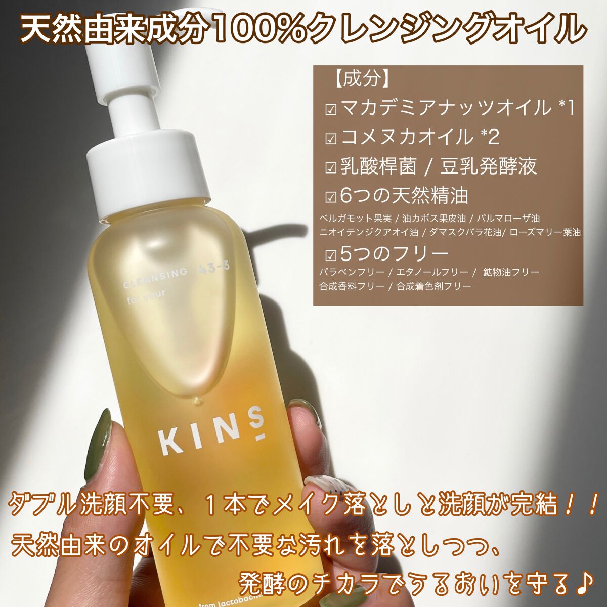 - 「W洗顔」などの過剰な洗顔や、洗浄力の高い界面活性剤の使いすぎは、肌にとって必要なうるおいや皮脂まで洗い流されてしまいます。 KINSのクレンジングオイルはメイクや皮脂はしっかりオフしながら、美肌のために必要なうるおいを守り、なめらかで肌あれしづらい肌へと導きます。 さらに、天然由来成分100%配合、洗浄成分および保湿成分を含めて植物由来成分は約99%配合を実現。ダブル洗顔不要で肌の負担を軽減することを追求しました。 香りにもこだわり、ベルガモットやダマスクローズなどの天然精油をブレンド。 リラックスしながら心地よいクレンジングタイムで、お肌も感情もリセットしましょう!