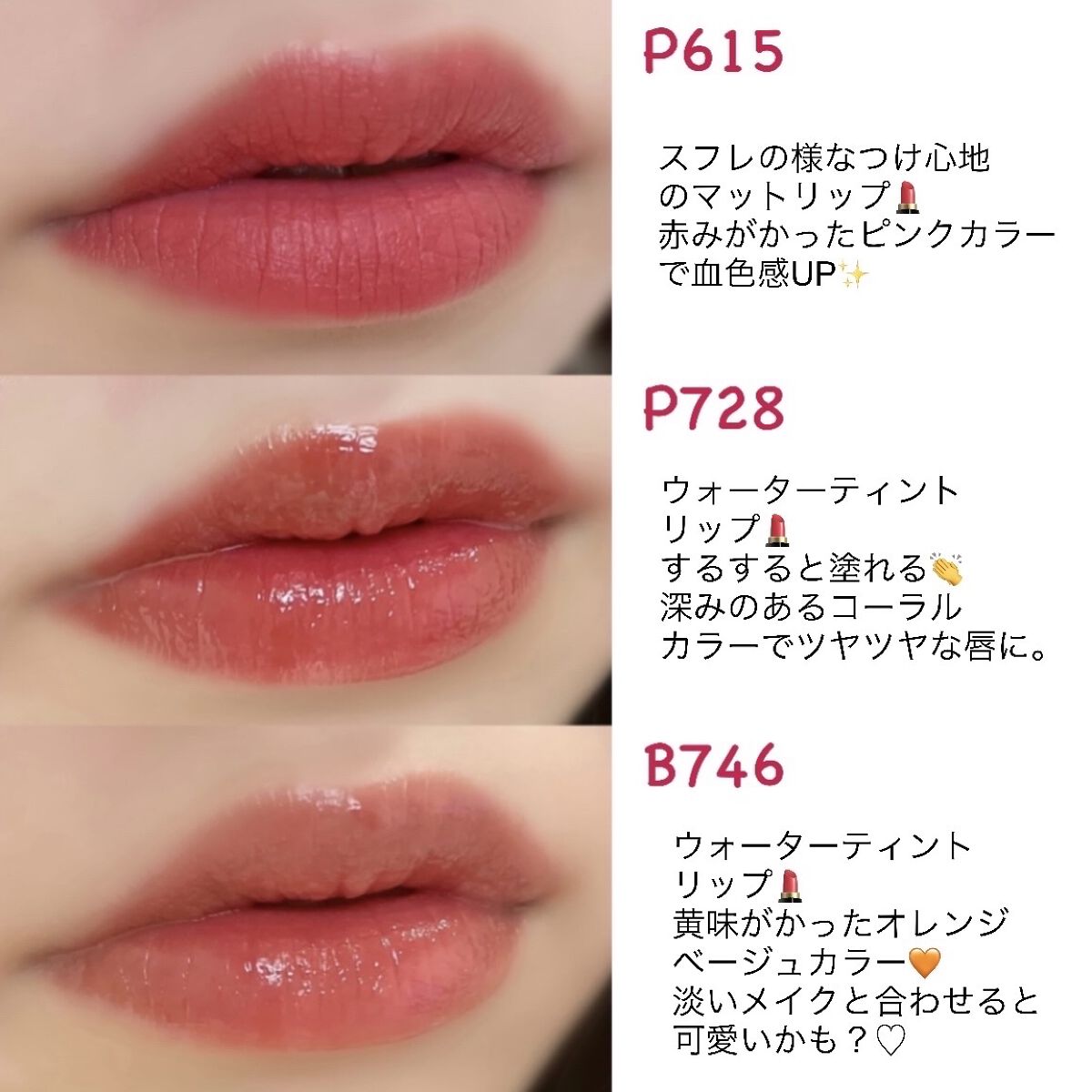 パケの可愛さに惹かれて購入〜! 私が買ったときは3色残ってて、全部欲しいのを我慢して「P747 ローズライチ」をチョイス! 透け感のあるローズピンクで、くすみっぽさもあるよ。けっこう薄付きな気がしてて唇の色ムラは完全にカバーできはしないんだけどちょうどいい立体感になって良いかも🤔 テクスチャーはちゅるっと軽めのタイプでベタつかない◎ 乾燥の季節にもネチョつかずに使えそう♡