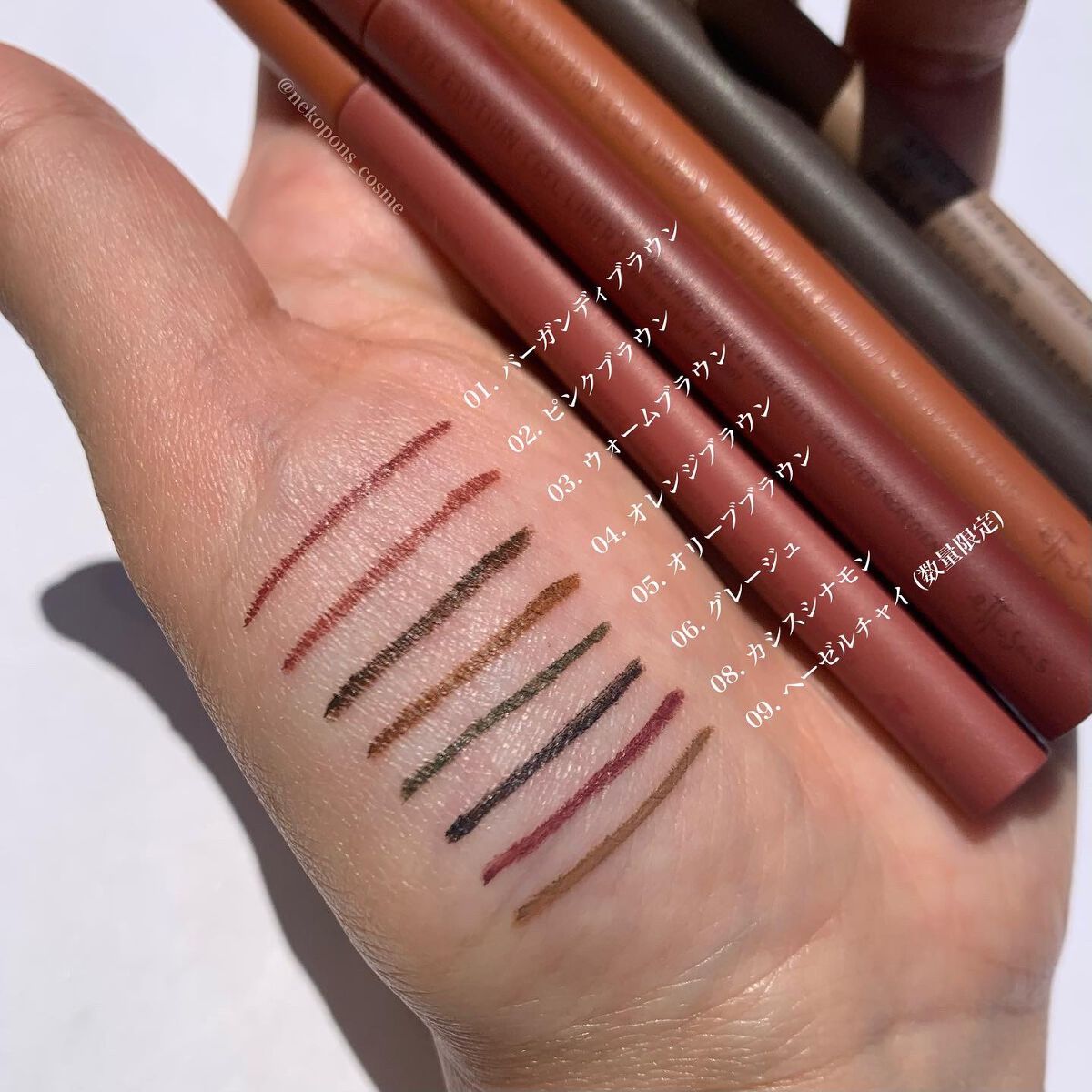- <02 ピンクブラウン> トリメチルシロキシケイ酸、メチルトリメチコン、ポリエチレン、(アクリレーツ/アクリル酸ステアリル/メタクリル酸ジメチコン)コポリマー、カルナウバロウ、キャンデリラロウ、スクワラン、ホホバ種子油、トリイソステアリン酸ポリグリセリル-2、水酸化Al、ジメチコン、トコフェロール、酸化鉄、酸化チタン、マイカ、グンジョウ <03 ウォームブラウン> トリメチルシロキシケイ酸、メチルトリメチコン、ポリエチレン、(アクリレーツ/アクリル酸ステアリル/メタクリル酸ジメチコン)コポリマー、カルナウバロウ、キャンデリラロウ、スクワラン、ホホバ種子油、トリイソステアリン酸ポリグリセリル-2、ジメチコン、トコフェロール、水酸化Al、酸化鉄、マイカ、酸化チタン、グンジョウ <04 オレンジブラウン> トリメチルシロキシケイ酸、メチルトリメチコン、ポリエチレン、(アクリレーツ/アクリル酸ステアリル/メタクリル酸ジメチコン)コポリマー、カルナウバロウ、キャンデリラロウ、スクワラン、ホホバ種子油、トリイソステアリン酸ポリグリセリル-2、ジメチコン、水酸化Al、トコフェロール、酸化鉄、グンジョウ、マイカ、酸化チタン <06 グレージュ> トリメチルシロキシケイ酸、メチルトリメチコン、ポリエチレン、(アクリレーツ/アクリル酸ステアリル/メタクリル酸ジメチコン)コポリマー、カルナウバロウ、キャンデリラロウ、スクワラン、ホホバ種子油、トリイソステアリン酸ポリグリセリル-2、水酸化Al、ジメチコン、トコフェロール、酸化鉄、酸化チタン、マイカ、グンジョウ <09 ヘーゼルチャイ> イソドデカン、トリメチルシロキシケイ酸、合成ワックス、(アクリレーツ/アクリル酸ステアリル/メタクリル酸ジメチコン)コポリマー、カルナウバロウ、ジフェニルシロキシフェニルトリメチコン、スクワラン、ホホバ種子油、ジメチコン、水酸化Al、トコフェロール、酸化鉄、酸化チタン、マイカ、グンジョウ <18 アプリコットブラウン> イソドデカン、トリメチルシロキシケイ酸、合成ワックス、(アクリレーツ/アクリル酸ステアリル/メタクリル酸ジメチコン)コポリマー、カルナウバロウ、ジフェニルシロキシフェニルトリメチコン、ホウケイ酸(Ca/Al)、スクワラン、ホホバ種子油、ジメチコン、水酸化Al、トコフェロール、酸化スズ、酸化鉄、マイカ、酸化チタン、グンジョウ <19 インディゴブラック> イソドデカン、トリメチルシロキシケイ酸、合成ワックス、(アクリレーツ/アクリル酸ステアリル/メタクリル酸ジメチコン)コポリマー、カルナウバロウ、ジフェニルシロキシフェニルトリメチコン、ジメチコン、トコフェロール、スクワラン、ホホバ種子油、水酸化Al、酸化鉄、マイカ、グンジョウ、酸化チタン、ホウケイ酸(Ca/Al)、酸化スズ <01 バーガンディブラウン> トリメチルシロキシケイ酸、メチルトリメチコン、ポリエチレン、(アクリレーツ/アクリル酸ステアリル/メタクリル酸ジメチコン)コポリマー、カルナウバロウ、キャンデリラロウ、スクワラン、ホホバ種子油、トリイソステアリン酸ポリグリセリル-2、水酸化Al、ジメチコン、トコフェロール、酸化鉄、グンジョウ、酸化チタン、マイカ <05 オリーブブラウン> トリメチルシロキシケイ酸、メチルトリメチコン、ポリエチレン、(アクリレーツ/アクリル酸ステアリル/メタクリル酸ジメチコン)コポリマー、カルナウバロウ、キャンデリラロウ、スクワラン、ホホバ種子油、トリイソステアリン酸ポリグリセリル-2、ジメチコン、トコフェロール、水酸化Al、酸化鉄、グンジョウ、マイカ、酸化チタン <08 カシスシナモン> カシスシナモン トリメチルシロキシケイ酸、メチルトリメチコン、ポリエチレン、(アクリレーツ/アクリル酸ステアリル/メタクリル酸ジメチコン)コポリマー、カルナウバロウ、キャンデリラロウ、スクワラン、ホホバ種子油、トリイソステアリン酸ポリグリセリル-2、水酸化Al、ジメチコン、トコフェロール、酸化鉄、グンジョウ、酸化チタン、マイカ <10 ピスタチオキャメル> トリメチルシロキシケイ酸、メチルトリメチコン、ポリエチレン、(アクリレーツ/アクリル酸ステアリル/メタクリル酸ジメチコン)コポリマー、カルナウバロウ、トリイソステアリン酸ポリグリセリル-2、キャンデリラロウ、スクワラン、ホホバ種子油、ジメチコン、水酸化Al、トコフェロール、マイカ、酸化鉄、酸化チタン、グンジョウ、コンジョウ <11 ロゼウッド> トリメチルシロキシケイ酸、メチルトリメチコン、ポリエチレン、(アクリレーツ/アクリル酸ステアリル/メタクリル酸ジメチコン)コポリマー、カルナウバロウ、トリイソステアリン酸ポリグリセリル-2、キャンデリラロウ、スクワラン、ホホバ種子油、ジメチコン、水酸化Al、トコフェロール、マイカ、酸化鉄、酸化チタン <13 ミモザブラウン> トリメチルシロキシケイ酸、メチルトリメチコン、合成ワックス、(アクリレーツ/アクリル酸ステアリル/メタクリル酸ジメチコン)コ