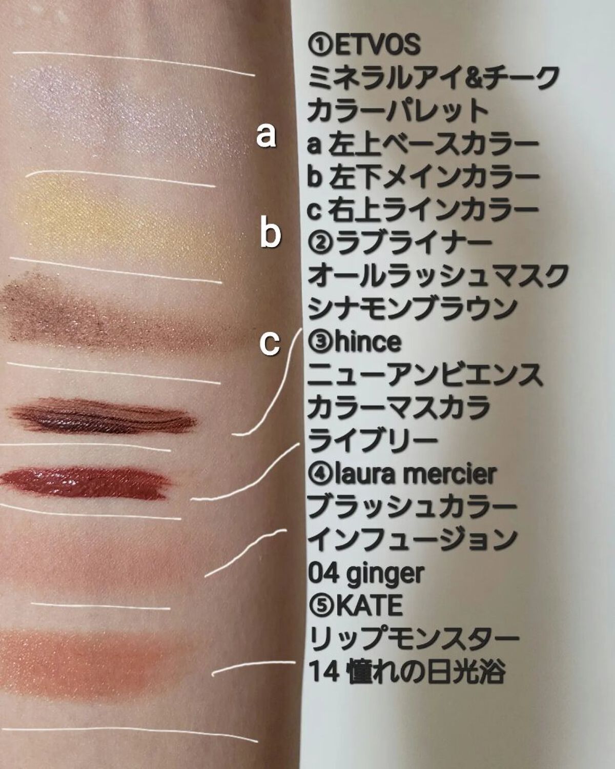 アイブロウは #WHOMEE の#レディモーヴ を使用! #hince の #ニューデップスアイシャドウパレット の a Lowkeyを上瞼全体に馴染ませる。 #rmk の#ザナウナウアイズ 02の #シークレットダスト を目頭に✨ #ヒンス の #ニューアンビエンスカラーマスカラ 上睫毛にブルーの#アンディファインド 下睫毛にオレンジ系の#ライブリー を。 #celvoke の #エンスロールマットリップス 03の テラコッタを💄💋
